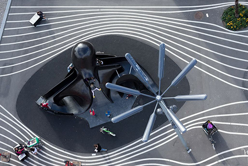 三个色彩鲜明的区域分别有着自己独特的氛围和功能,红色区域为相邻的体育大厅提供了延伸的文化体育活动空间,黑色的区域是当地人天然的聚会场所,绿色的区域提供大型体育活动用地。这个项目不仅是一个城市设计,更是一个全球城市最佳展示区,设计成果最终包含了来自60个不同国家的120种不同事物。