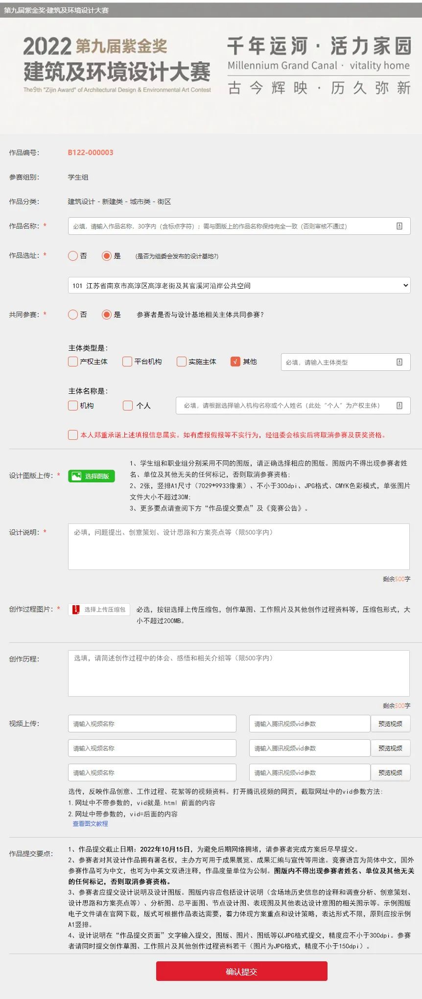 今年作品提交页面包括作品名称、作品选址、共同参赛、设计图版和设计说明等内容。