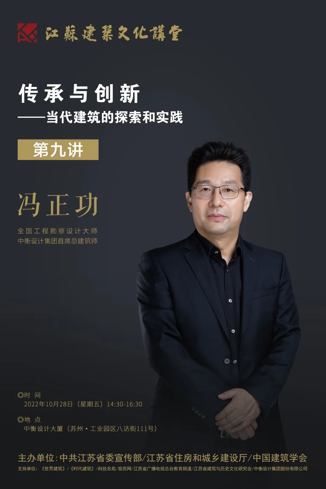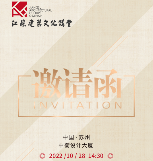 由中共江苏省委宣传部、江苏省住房和城乡建设厅、中国建筑学会联合主办的“江苏·建筑文化讲堂”第九讲将于10月28日在苏州中衡设计大厦举办。本次讲堂由全国工程勘察设计大师冯正功担任主讲嘉宾,作题为《传承与创新:当代建筑的探索和实践》的演讲。