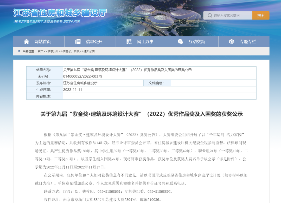 根据《第九届“紫金奖·建筑及环境设计大赛”(2022)竞赛公告》,大赛组委会组织开展了以“千年运河 活力家园”为主题的竞赛活动,共收到有效作品1451项。经专业评审委员会评审,省住房城乡建设厅机关纪委全程参与监督、法律顾问现场见证,共产生优秀作品奖180项,其中学生组89项(一等奖10项、二等奖30项、三等奖49项),职业组91项(一等奖10项、二等奖31项、三等奖50项),以及学生组入围奖97项。现将评审获奖作品、获奖单位及获奖人员名单予以公示(详见附件)。