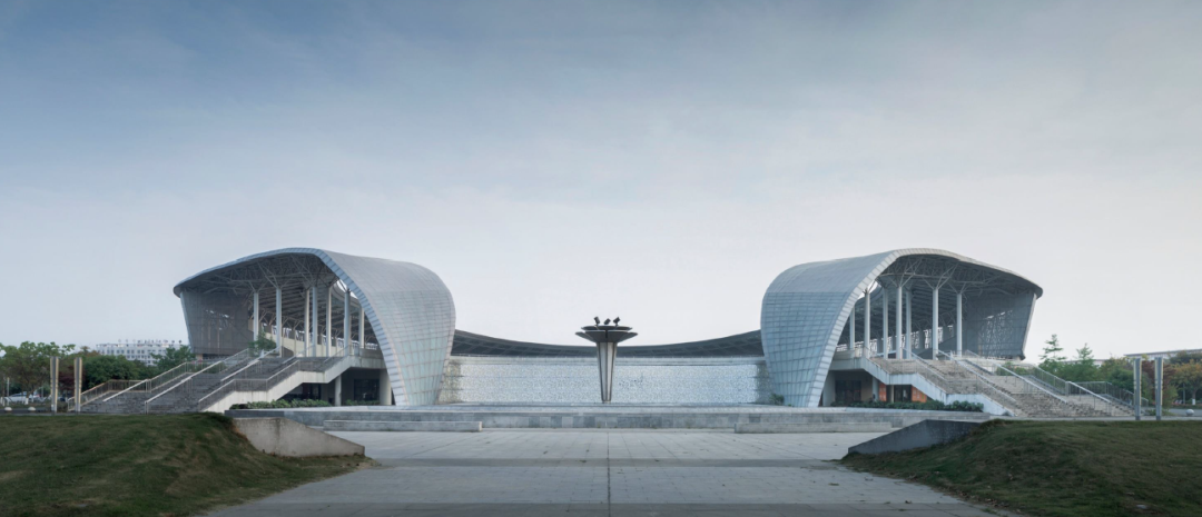 绵竹体育中心也是江苏对口援建的一个大型文化工程项目。场地曾作为地震灾后的临时避难空间。因此,在设计的时候,我们取意“舞动的彩带”,以流动曲线构建传达运动场地的流动特性与空间韵律,“飘带”既以“环抱”的姿态守护逝者,又以“舞动”的姿态慰勉生者。结合体育馆的功能需求,我们设计了一个有烛台含义的火炬,期冀记录这一段历史,承载绵竹人民抗震救灾的种种记忆,传递新生活的新希望。