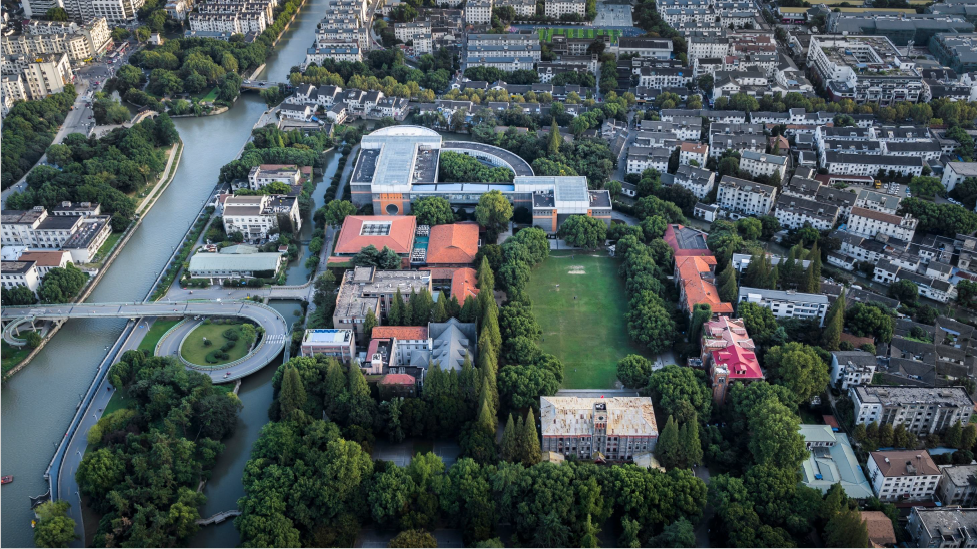 前身为东吴大学的苏州大学,至今已有120余年历史。王健法学院的选址位于苏州大学校址中轴线的南端,既是老校区的终点,又是新校区的起点。法学院的一侧邻近老城区河道,与苏州传统民居隔岸相对。