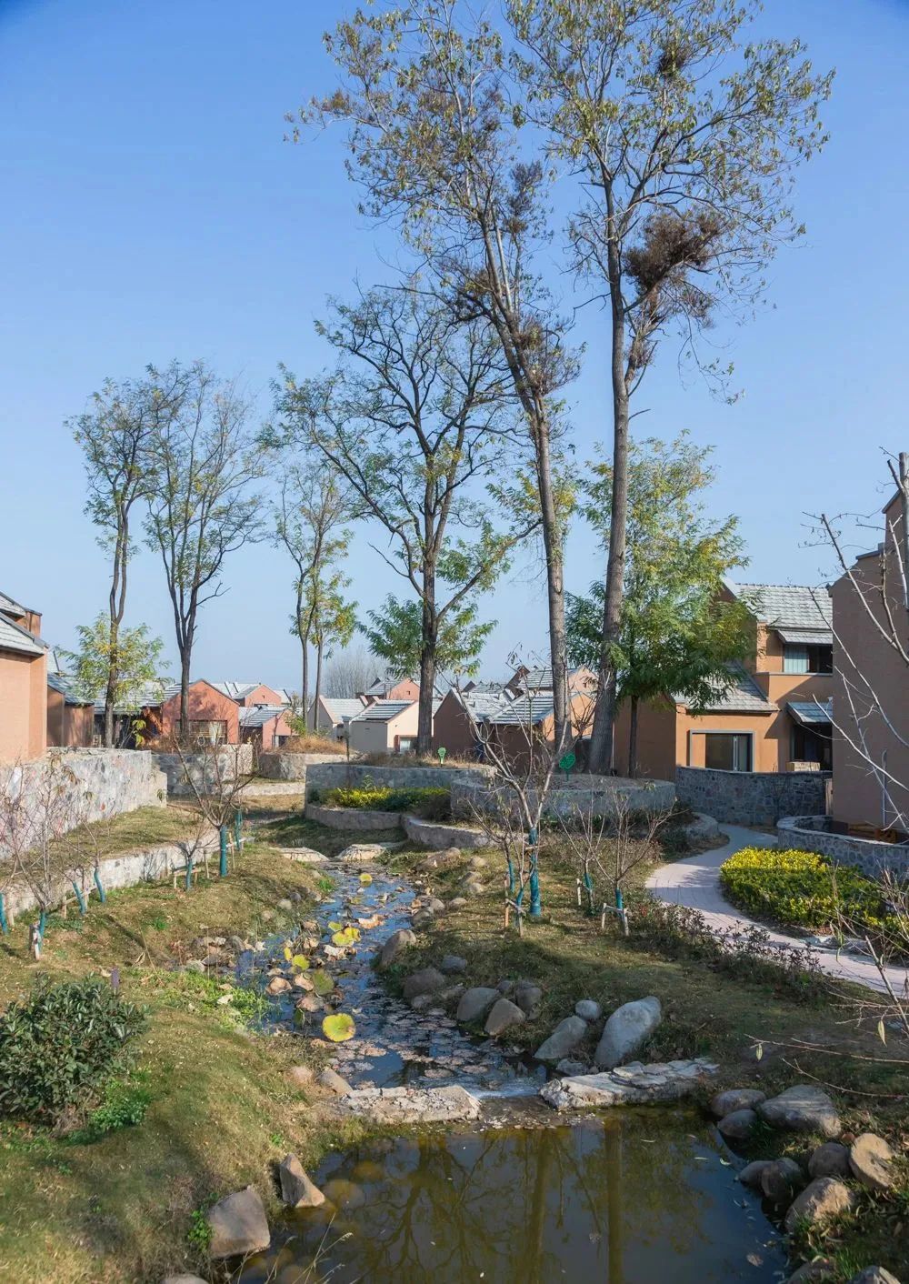为了方便村民生产生活,我们利用太阳能把黄河边的水抽取上来,在村里面形成小溪,供农民浇菜、冲洗厕所使用。这些小溪又结合所有保留的树种,成为了乡村的一景。在村庄建设的过程中,我们的施工队伍大部分为当地的农民、当地的石匠。房屋建成后,他们也很有成就感,因为所有房屋都是他们自己砌筑而成的。