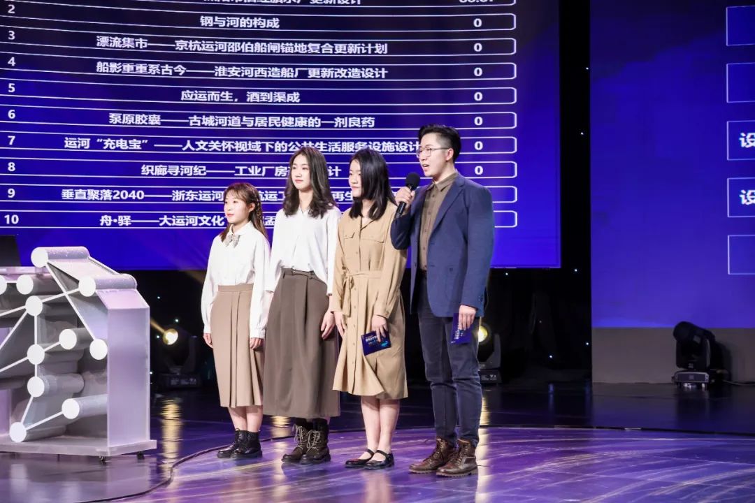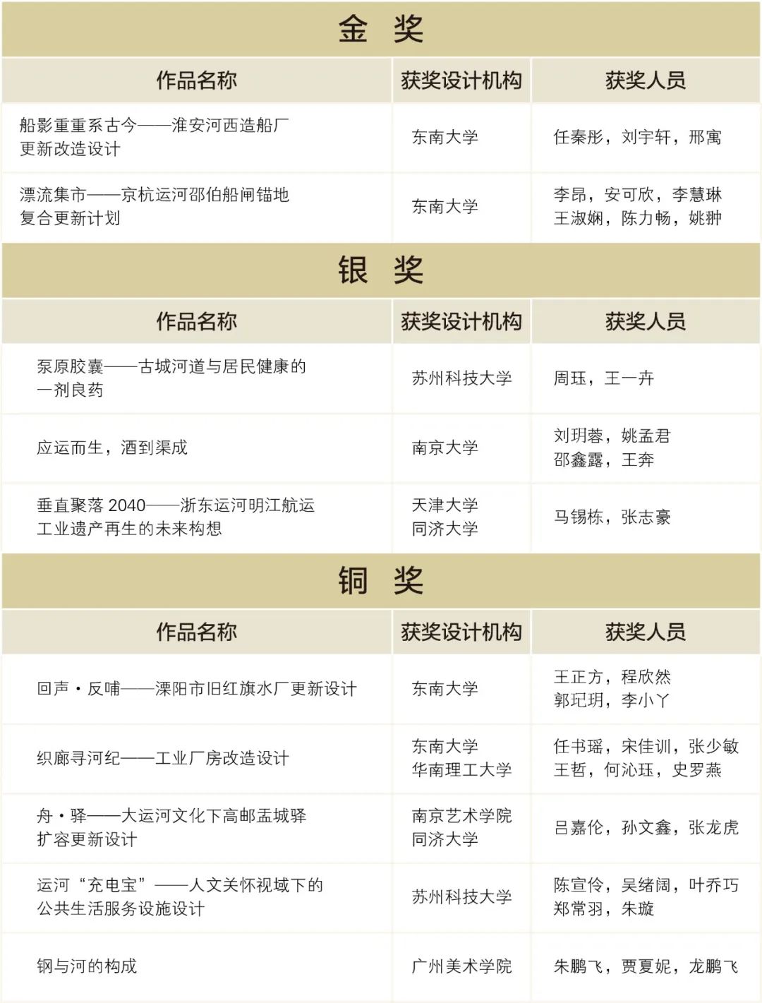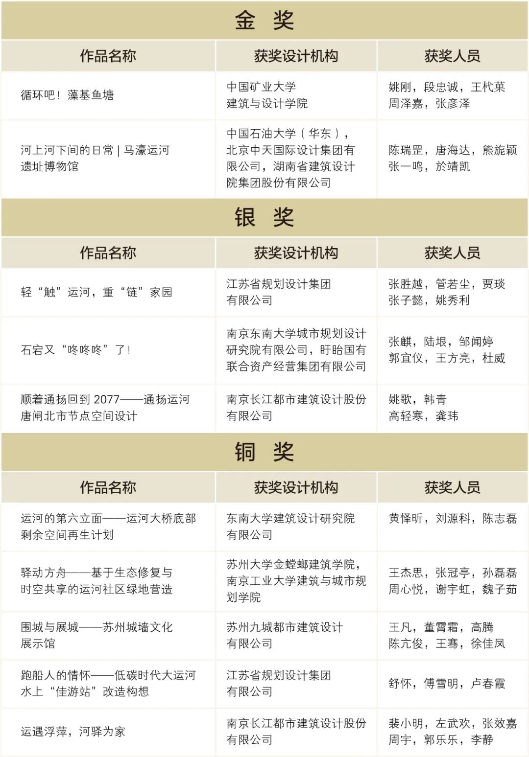 学生组和职业组最终各产生紫金奖金奖2名、银奖3名和铜奖5名。其中,学生组《船影重重系古今——淮安河西造船厂更新改造设计》《漂流集市——京杭运河邵伯船闸锚地复合更新计划》及职业组《循环吧!藻基鱼塘》《河上河下间的日常|马濠运河遗址博物馆》荣获“紫金奖”金奖。