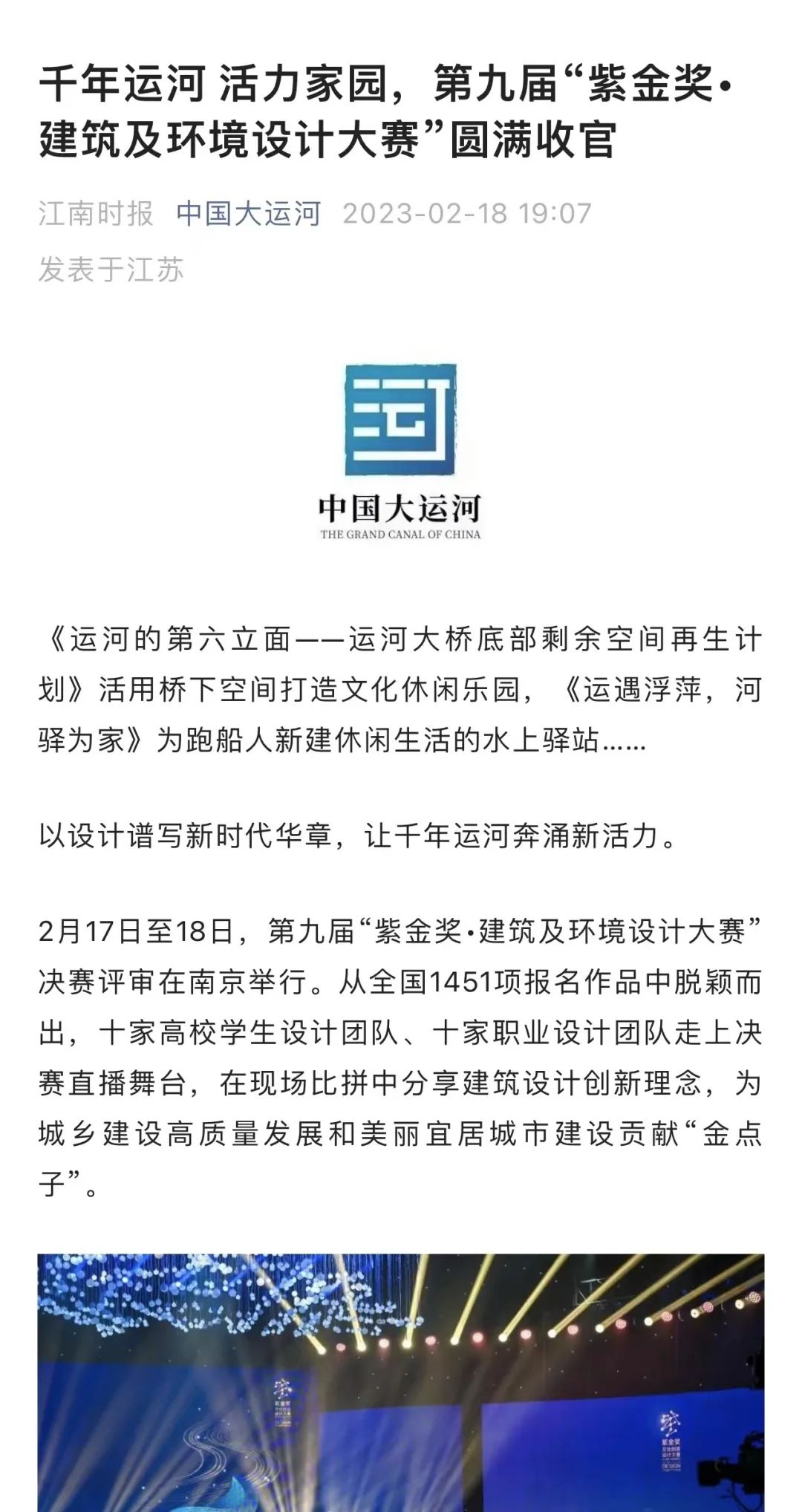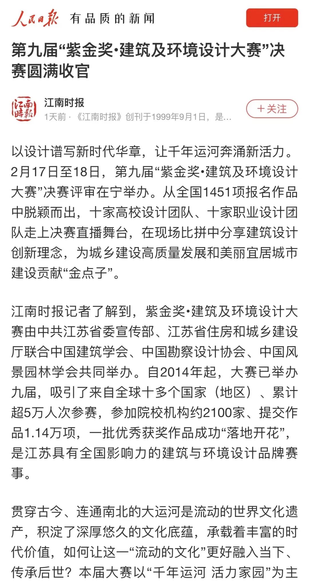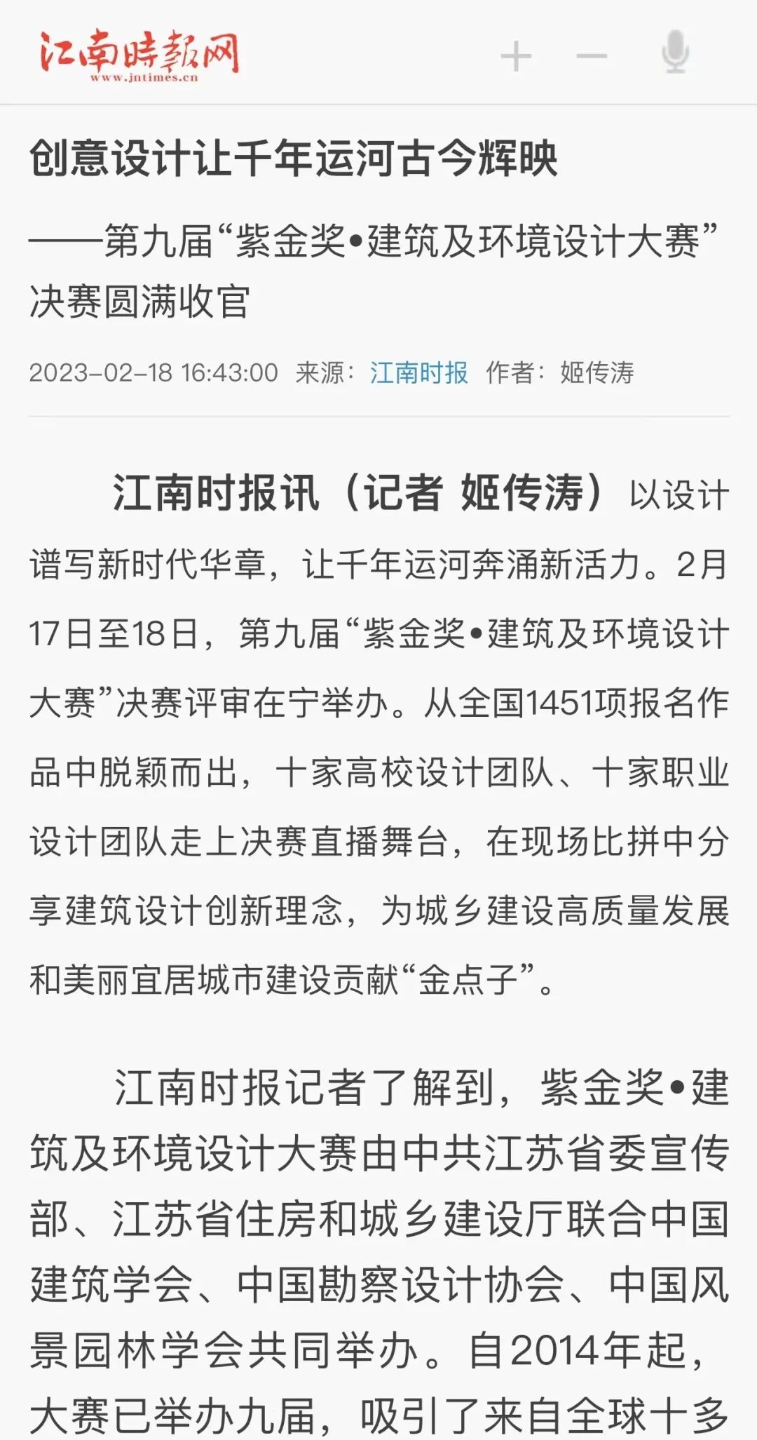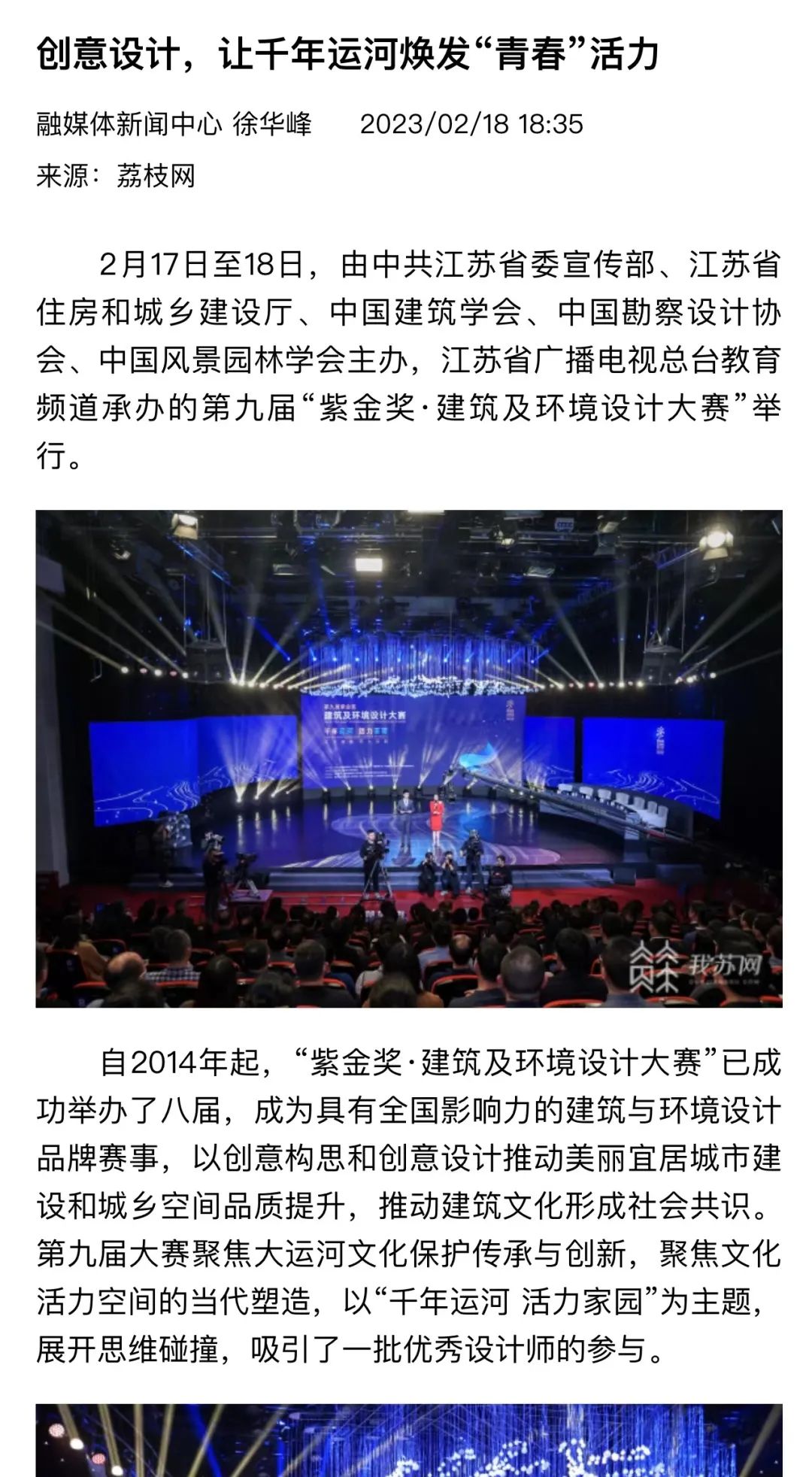 2月17日至18日,由中共江苏省委宣传部、江苏省住房和城乡建设厅、中国建筑学会、中国勘察设计协会、中国风景园林学会主办,江苏省广播电视总台教育频道承办,江苏银行、江苏省勘察设计行业协会、江苏省建筑与历史文化研究会协办的第九届“紫金奖·建筑及环境设计大赛”综合评审(决赛)在南京举行。来自全国各大高校、建筑设计机构的20个参赛团队进入电视决赛,角逐“紫金奖”金、银、铜奖。