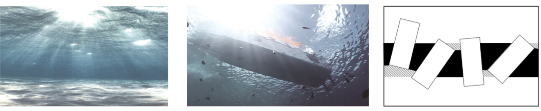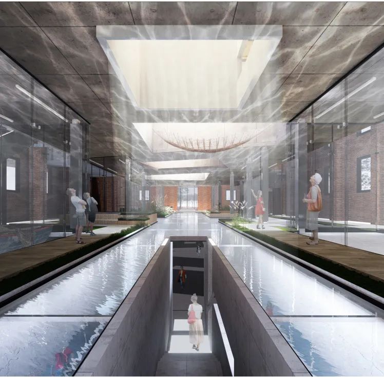 最后,阳光由置入的光筒射入,建筑一层(河面)水面将射入的阳光折射入负一层(河底)的博物馆中,营造出运河河底水波荡漾的意象,进一步打造出静谧悠然的历史氛围。
