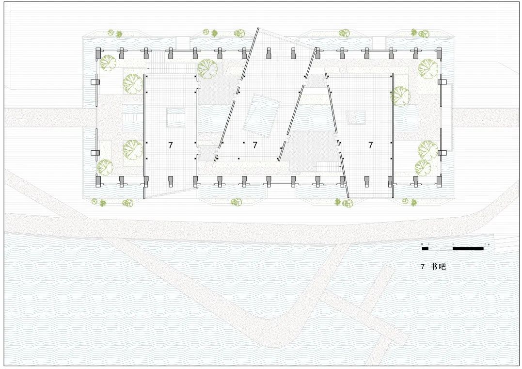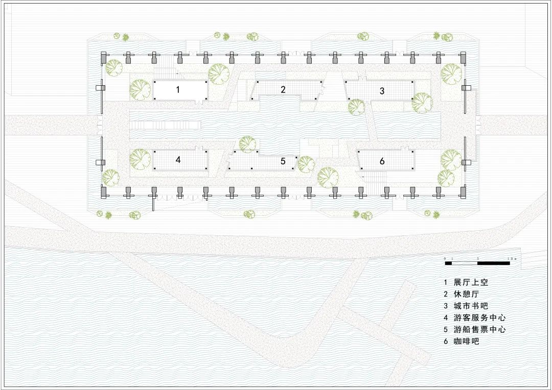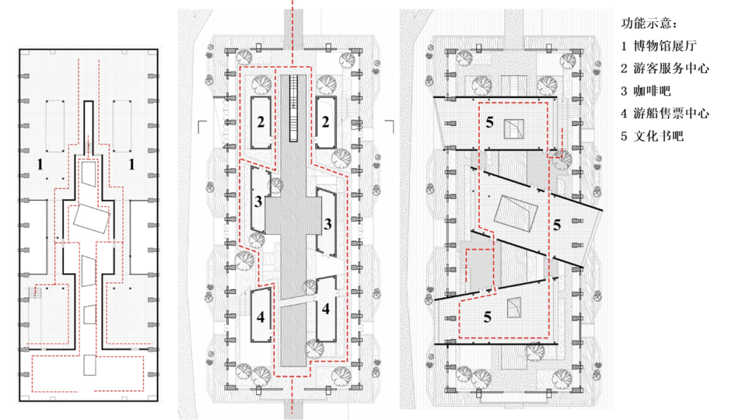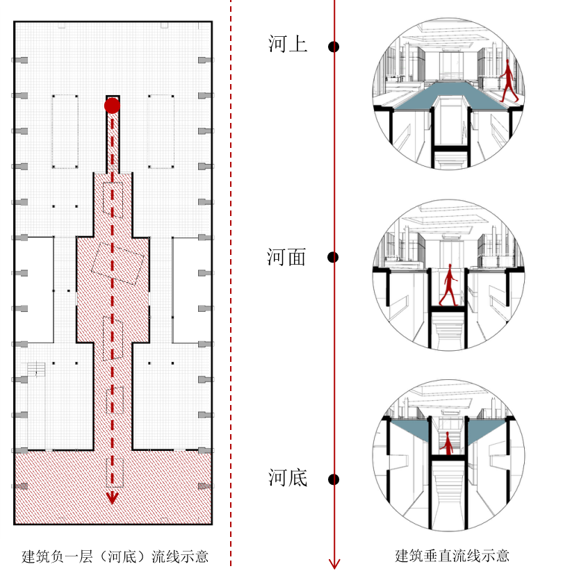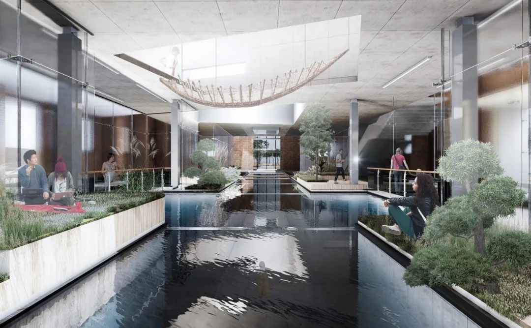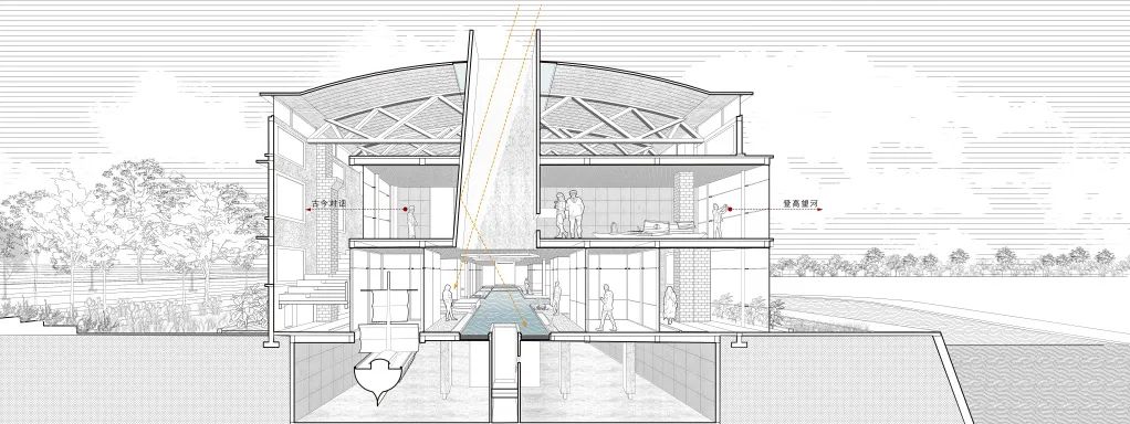 在功能设置上,建筑负一层(河底)是历史博物馆,人们回味过去,沉浸在运河记忆中;建筑一层(河面)是城市客厅,人们参与现代都市的滨水活动;建筑二层(河上)书吧是传承文化的场所,亦可在此远眺重新恢复生机的里运河。