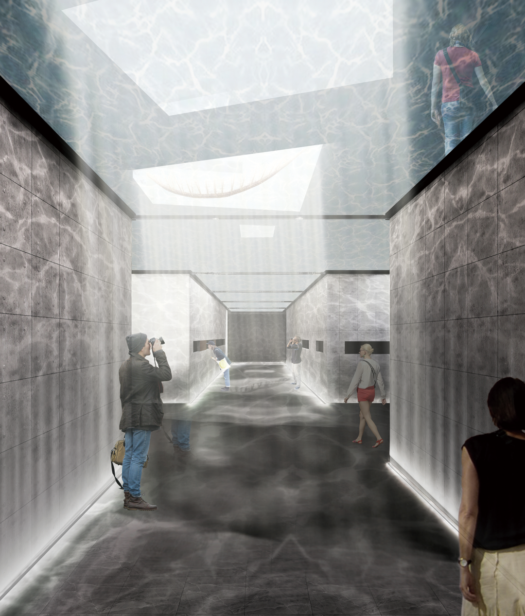 首先,在建筑的入口设计方面,我们通过长梯将游客和市民引入博物馆中。人们随着踏步拾级而下时,水面逐渐由头顶漫过,仿佛让人们步入运河之下。
