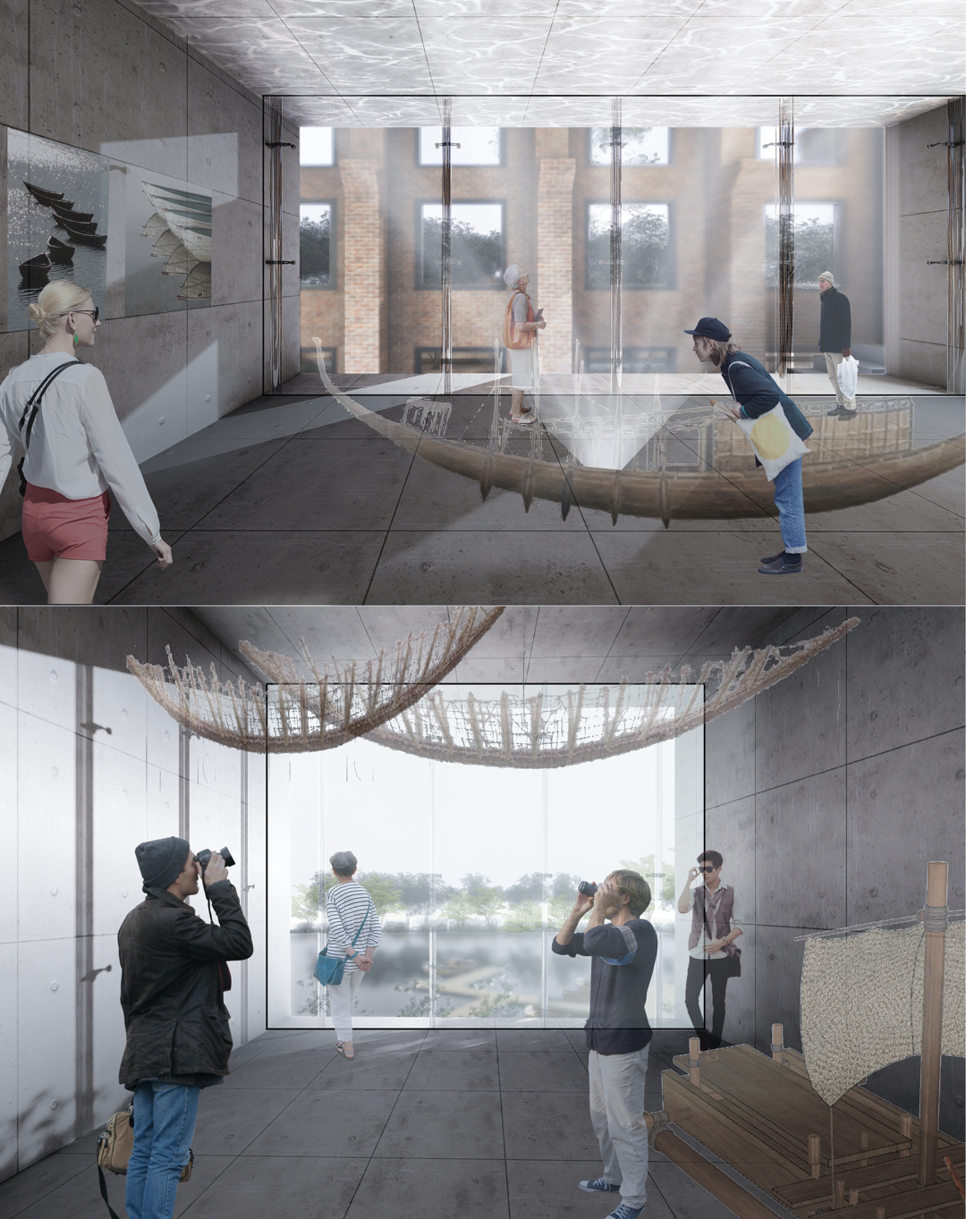 其次,在空间意向营造方面,我们将沉淀千年的运河河床意象进行现代空间转译,将博物馆打造为过去繁景记忆的空间重现。结合船间光影意向,在博物馆中进行光影组合,进一步呈现“地下沉淀着古运河”的设计理念。