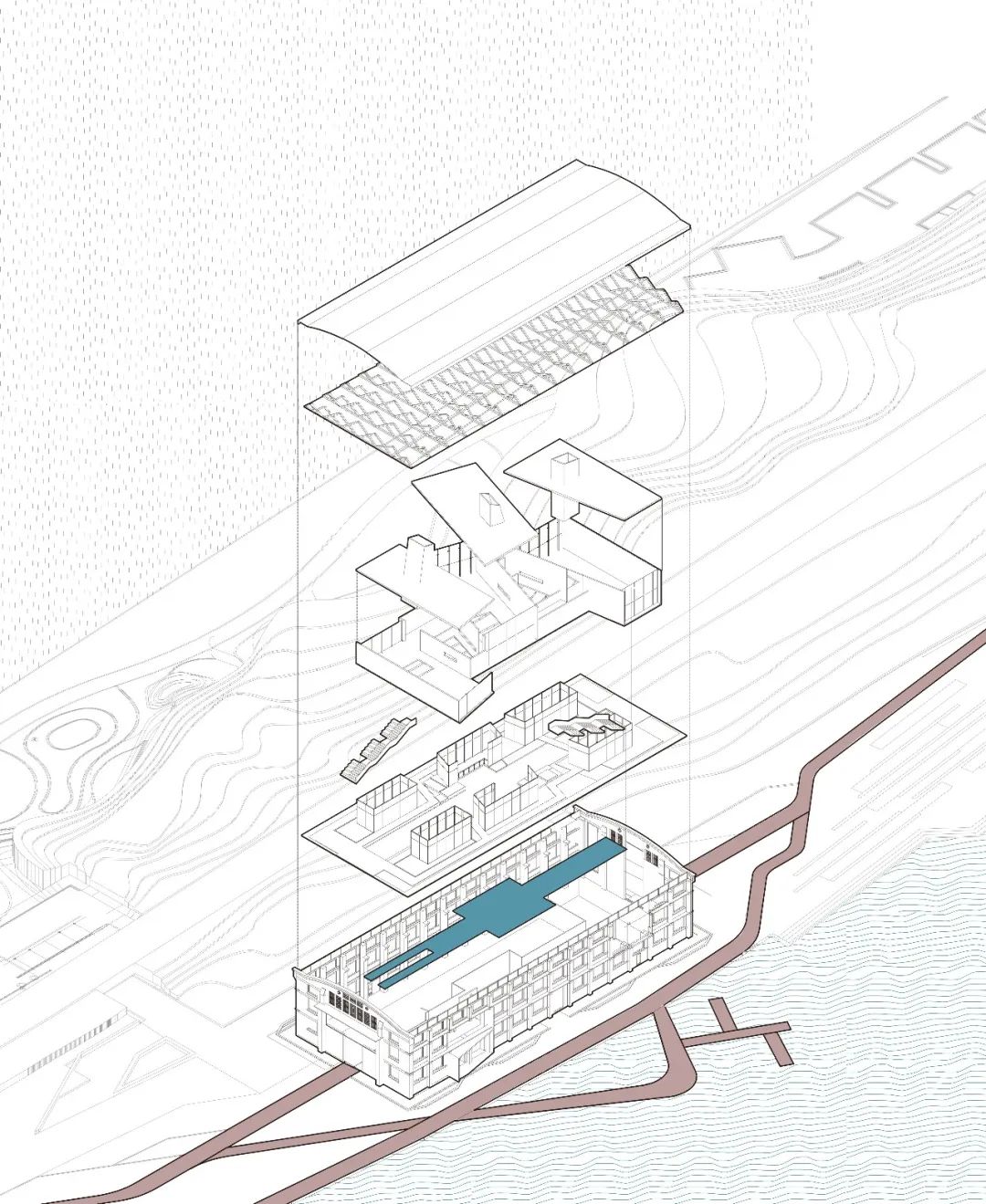 整体建筑空间构建了完整的垂直观览路线,从入口向下的楼梯穿过水面进入博物馆,上到城市客厅,再到书吧。动态的流线反映历史的演进,从回忆到体验再到传承,历史因此而流动。