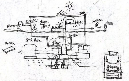 当前,人们对于舒适居住环境和丰富场景体验的需求日渐增长,我们设计的关注点从最初的住宅、公共空间,转向寻找老百姓身边经常接触但易被忽视的设施元素。最后,经过讨论,我们设计方案聚焦寻找联结“家空间”,“人建筑自然”的载体,并最终选择了一个与百姓生活密切关联的泵站,作为我们的设计对象。对于我们团队而言,这个方案也是超出本身专业的初次探索。