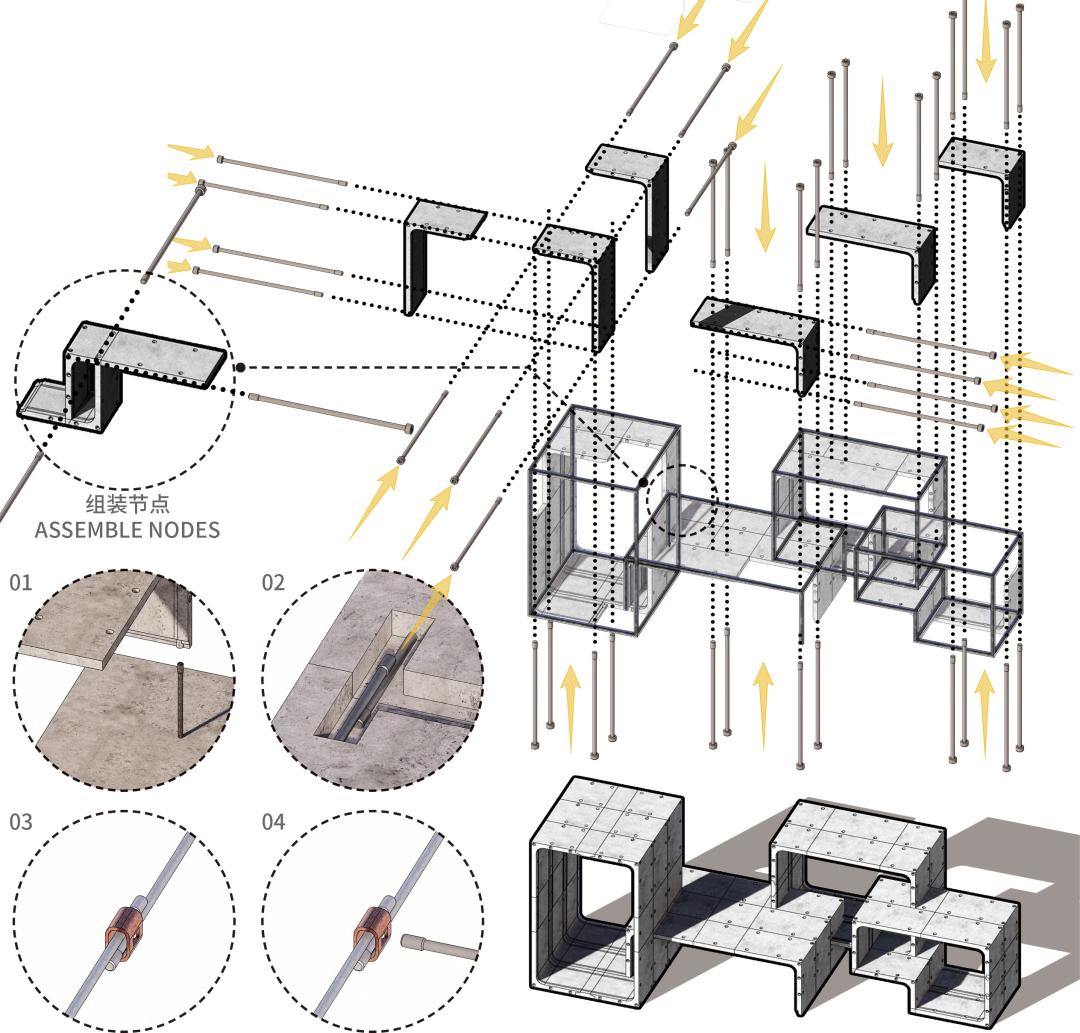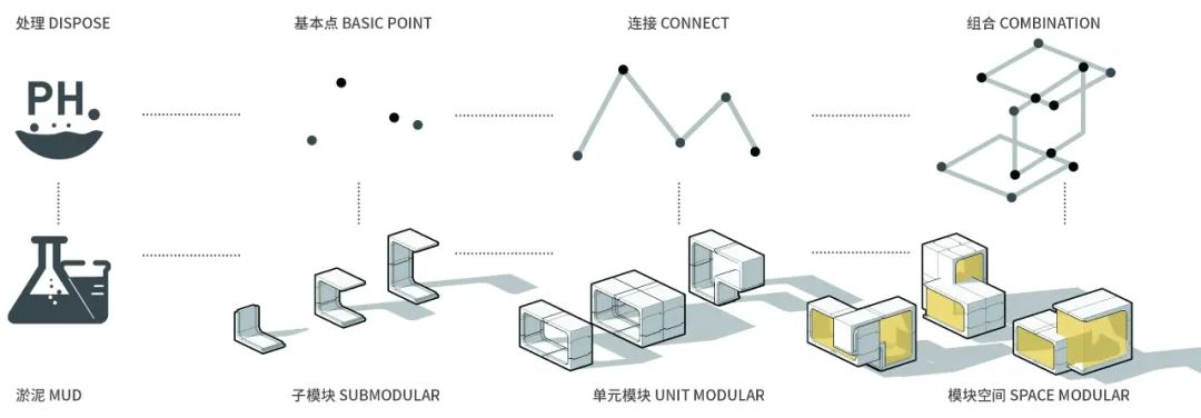 抽取河道淤泥,净化河道水质,将处理后的淤泥作为胶囊预制模块基本材料,并根据功能需求进行胶囊空间的定制式设计。同时,将不同的胶囊空间进行连接与组合,从而塑造出多维且可生长的模块空间。