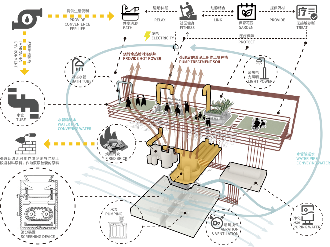 首先,胶囊由预制构件构成,可在多个场地灵活组装拆解,满足人们不同生活需求,为城市空间带来更多的优化可能。其次,胶囊可基于建造需要临时获取环保建筑材料,通过泵原胶囊的“心脏”——泵站抽取河道淤泥进行筛分处理,将筛分后的淤泥土制成砖,作为建筑材料,其余热可为二层淋浴装置供热,同时淤泥土也可作为土壤培育药材,实现材料循环利用。