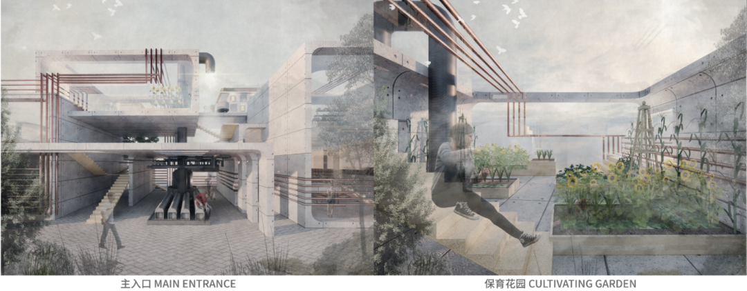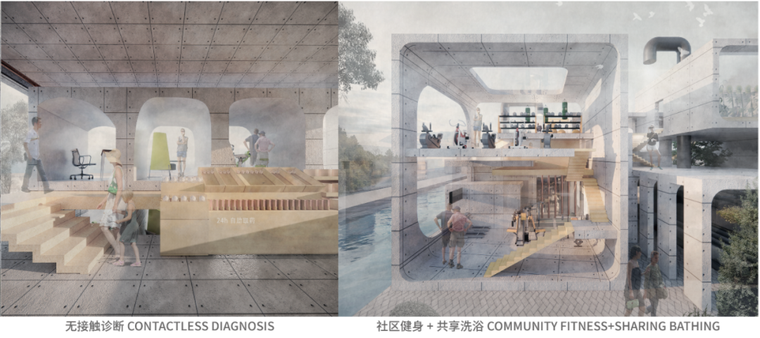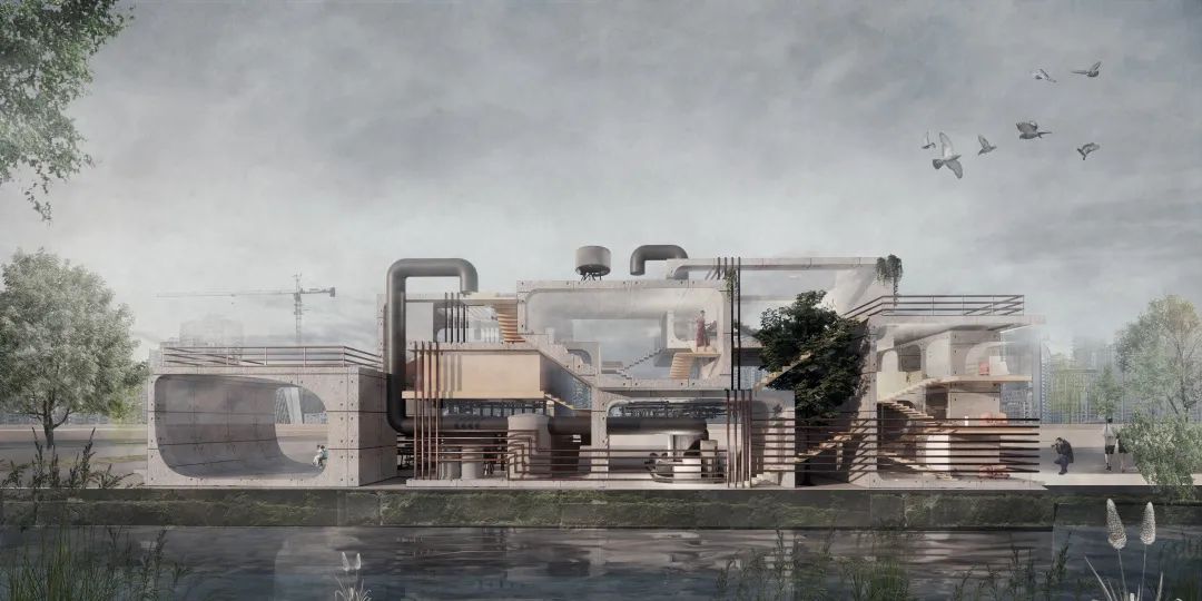 作品聚焦容易被人们忽略的运河泵房空间,就地取材,将场地的废弃物——淤泥土作为原材料,通过一系列胶囊体块的联结,组成了兼具儿童保育、洗浴运动、净水清淤等多功能的泵房组合体,创造出可生长的模块化“泵原胶囊”,赋予更多弹性发展的可能,为古城河道生境与居民身心健康提供了一种改善新路径,具有较好的启发性与一定的现实意义。设计集合了节能循环的绿色理念以及多元共享的公共空间理念,以原材料的多用途丰富了“千年运河”,以胶囊房的多功能展现了“活力家园”。
