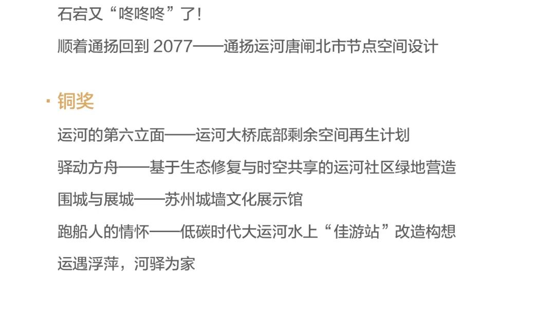参赛作品聚焦具有真实的历史记忆和历史文化的场地,创作了一批题材多元、亮点纷呈、富有创意的设计方案。近期微信公众号将逐步推出第九届紫金奖建筑赛获奖作品解读,期待能为大运河文化保护传承与创新,大运河活力空间的当代塑造提供思考启迪。