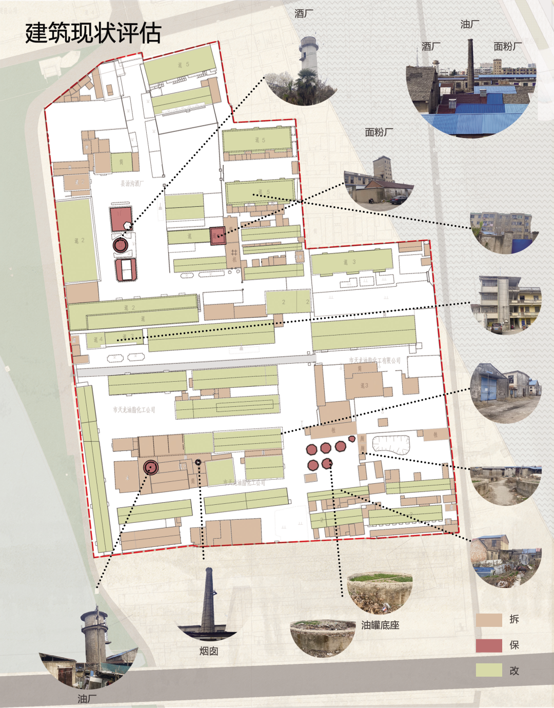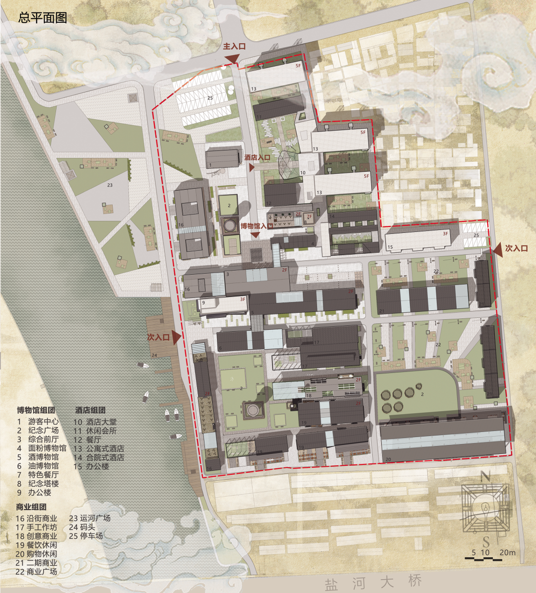 设计对位于大运河支流盐河岸边的酒厂、油厂和面粉厂地段进行更新改造,在保留原有标志性历史记忆点基础上,设置博物馆、酒店、商业三个新的功能组团,旨在延续大运河的历史文脉,焕发大运河沿线城镇昔日的辉煌。设计主题明确,构思新颖,功能配置合理,对大运河沿线城镇历史地段或工业街区的保护更新具有探索意义。建议围绕现有酒厂、油厂和面粉厂的历史概述、建筑现状评估“拆保改”的确定依据以及三个组团的具体功能进行补充说明。
