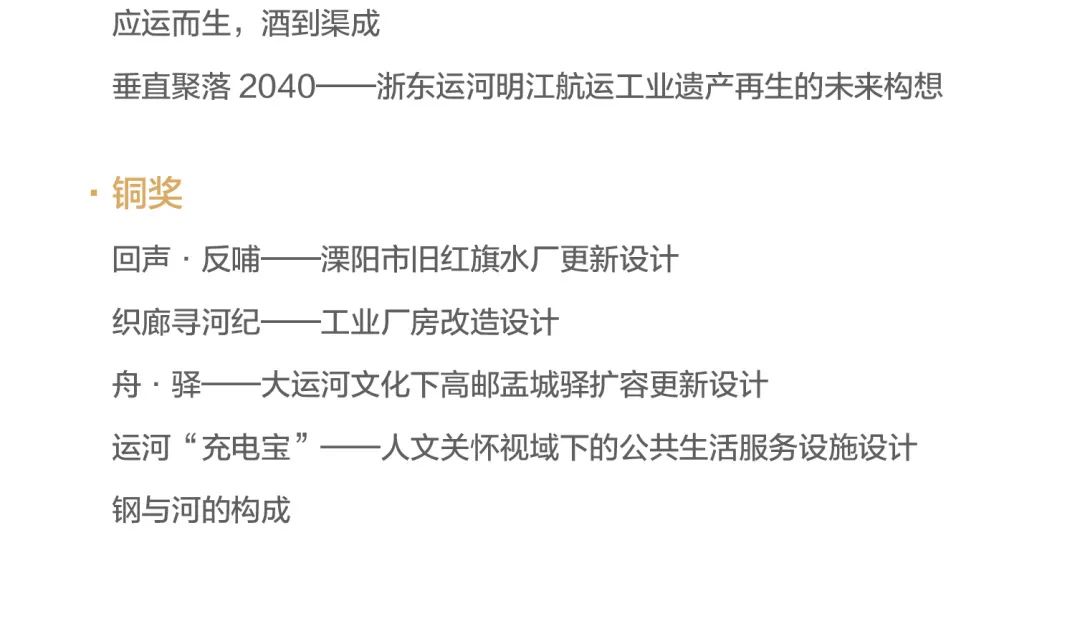 参赛作品聚焦具有真实的历史记忆和历史文化的场地,创作了一批题材多元、亮点纷呈、富有创意的设计方案。近期微信公众号将逐步推出第九届紫金奖建筑赛获奖作品解读,期待能为大运河文化保护传承与创新,大运河活力空间的当代塑造提供思考启迪。