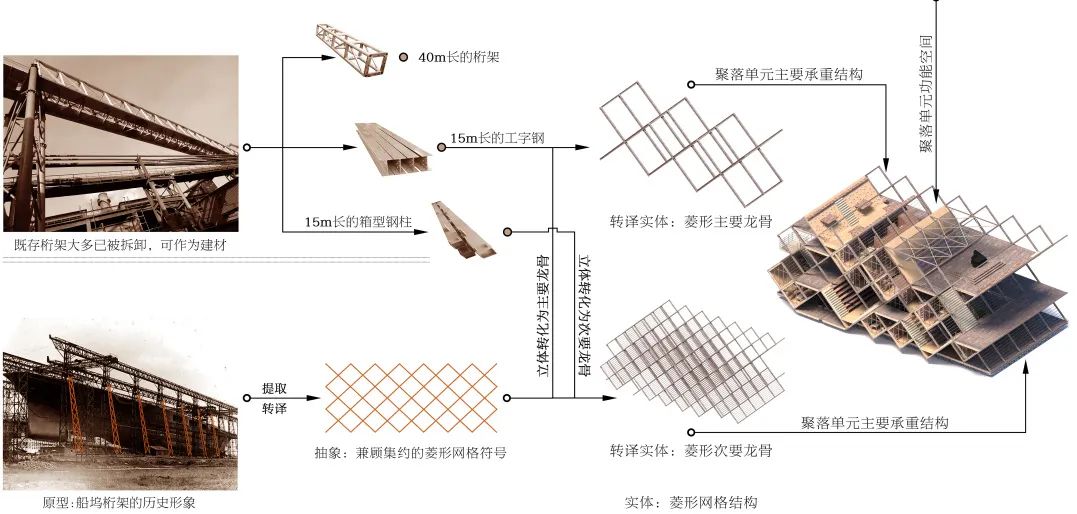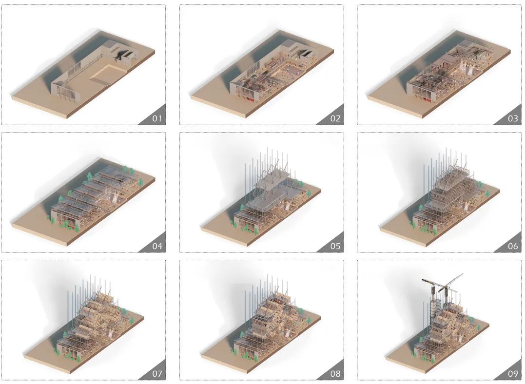 “垂直聚落”建构流程大致包括三步骤:首先,整饬既存室内外场地,梳理可利用空间,重塑空间结构,植入停车场、剧场、商业等公共功能,营建城市客厅。其次,组建竖向钢柱、网格桁架等聚落结构体系。最后,装设可升降的施工塔吊,塔吊内设计交通竖井,打造流线畅通有序的内部交通流线。