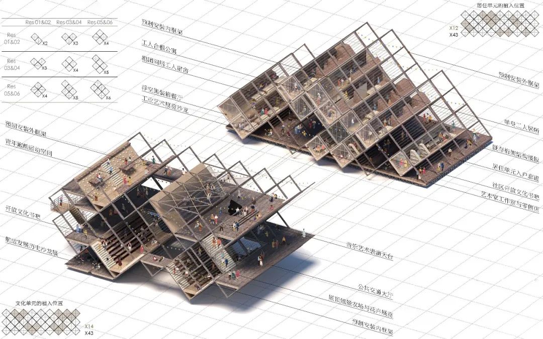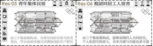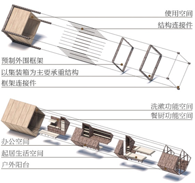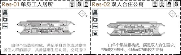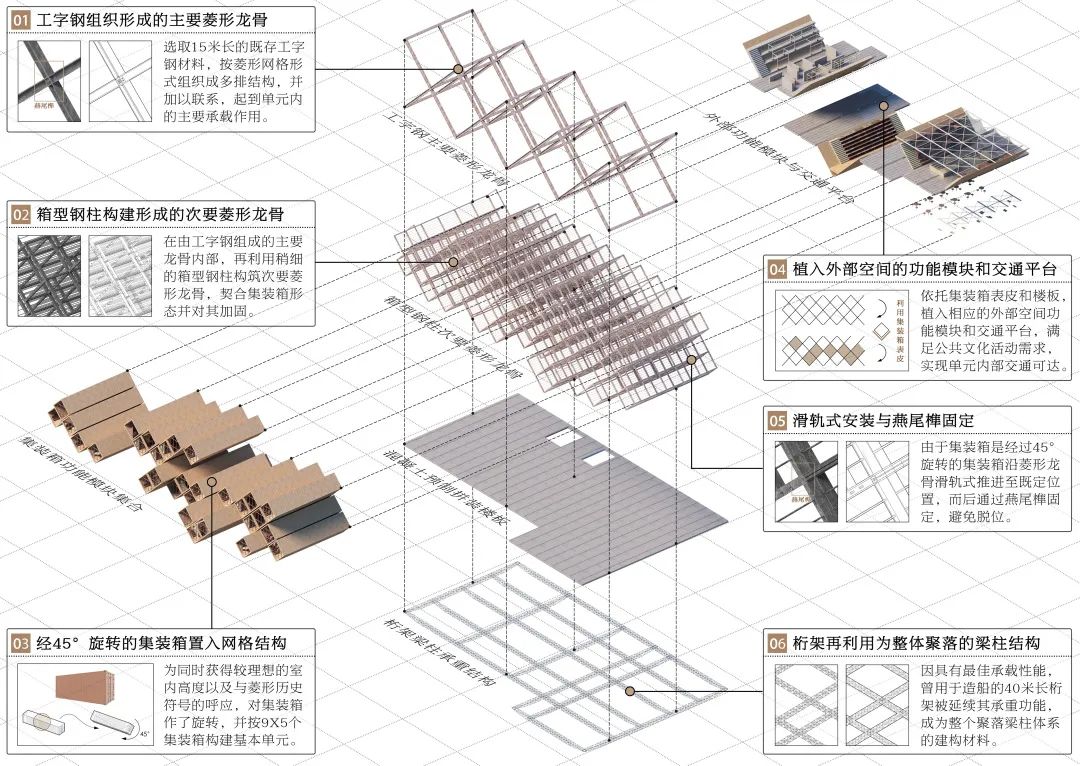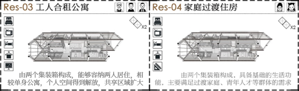 设计方案将集装箱作为空间载体,进行定制化、模块化设计。在结构层面,将集装箱作45度旋转,同时以工字钢结构和箱型钢柱分别作为主要和次要菱形龙骨,以增强集装箱结构稳定性。在功能方面,按照不同功能需求对集装箱内部家具进行预先定制,如单身工人居所、双人合住公寓、工人合租公寓、家庭过渡住房、青年集体民宿等。