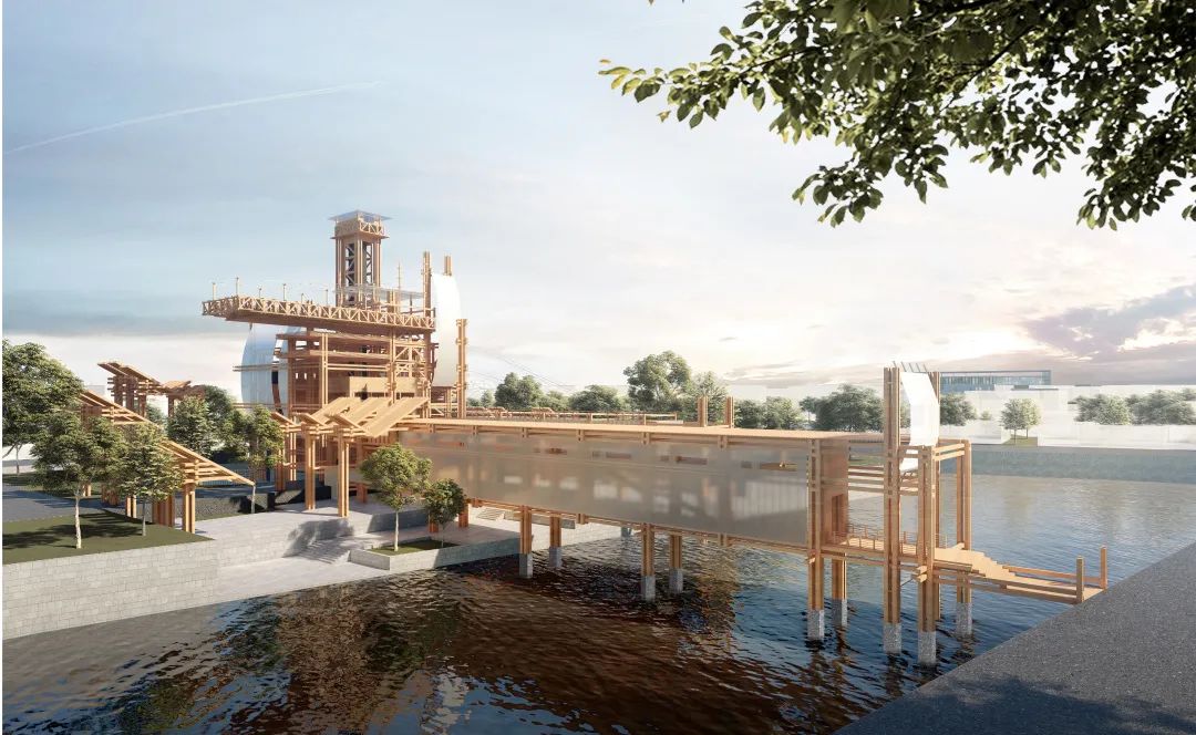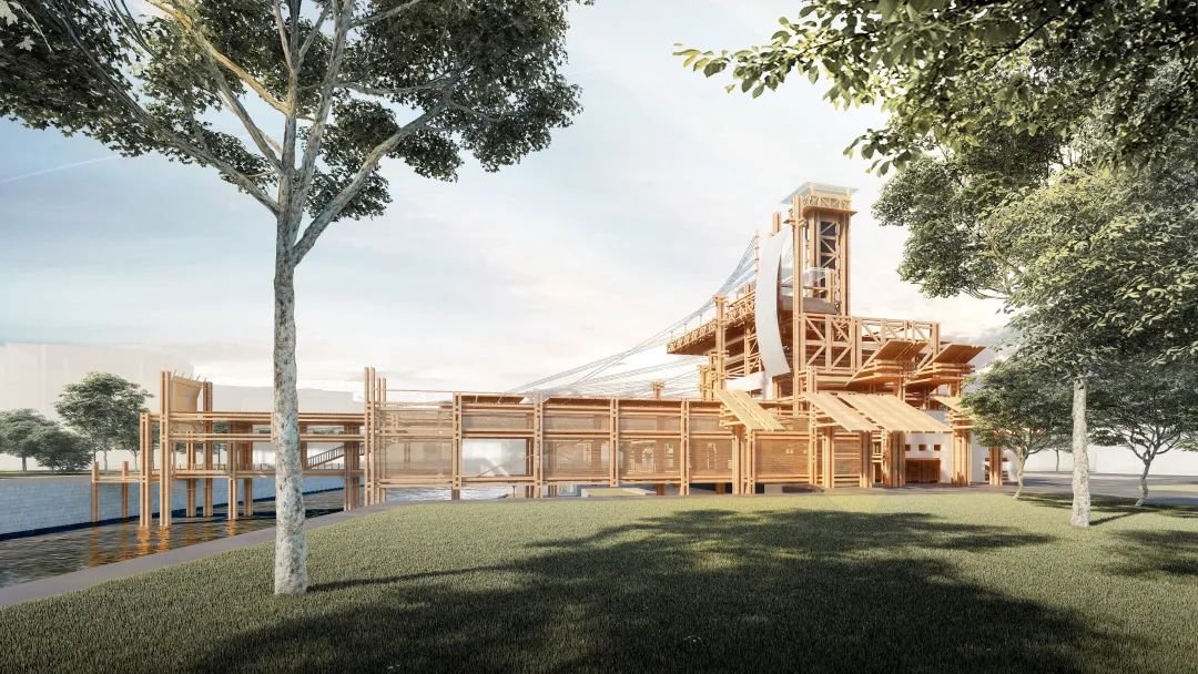 以木构建筑形式和廊道市集作为空间节点,链接马塘河两岸,引导周边社区人流进入饮马洲。人们可以在观景台登高眺望,在圆形剧场体验丰富活动,在历史展陈廊道观赏运河洲岛美景,感受大运河文化。
