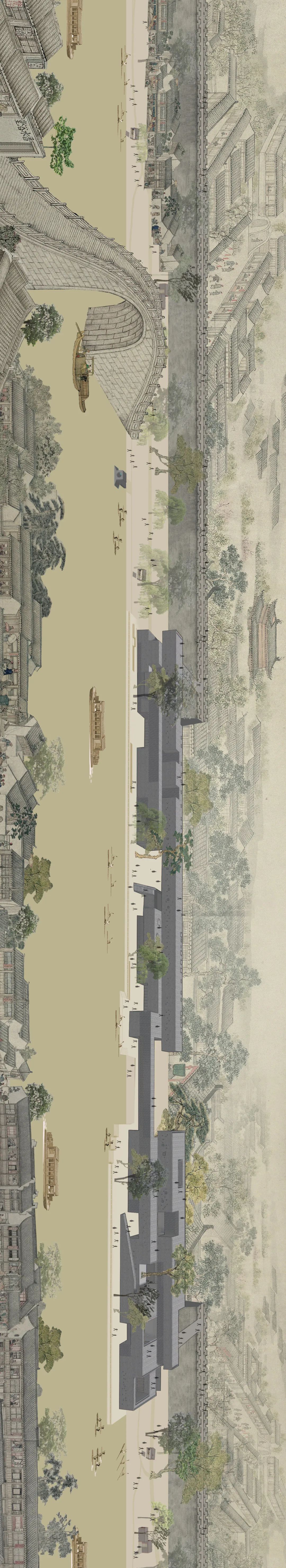 京杭大运河在不同的地理区段呈现出不同的面貌。在江南水乡的核心城市苏州,古老的运河与古城城墻、护城河共同形成了整体性的节点空间。苏州城墙文化展示馆设计准确抓住了这样的文化背景和空间特质,将基地选在城墙与护城河之间,通过简洁现代的砖体建筑与两者同源对话,讲述了历史与文化的故事,使人们对于河道与苏州古城之间的不可分割性有了更加直接深刻的体验。