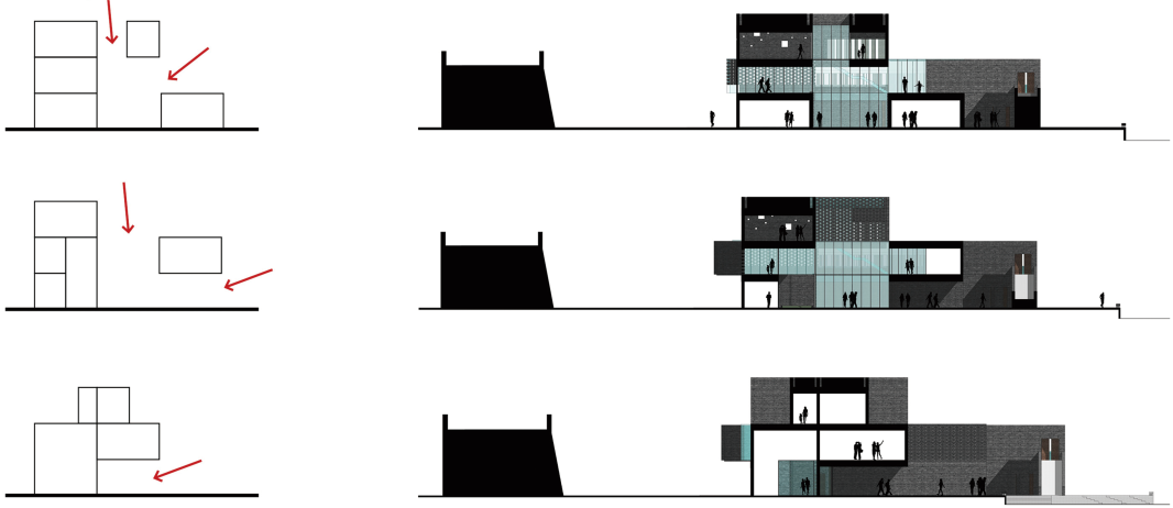 建筑沿护城河南北向展开,通过建筑体块的收缩退进,在城墙和护城河之间寻求平衡:多个庭院既面向护城河水面,也面向东侧古城墙遗址,形成动态的游览空间,象征护城河在城墙水院间自由流动。