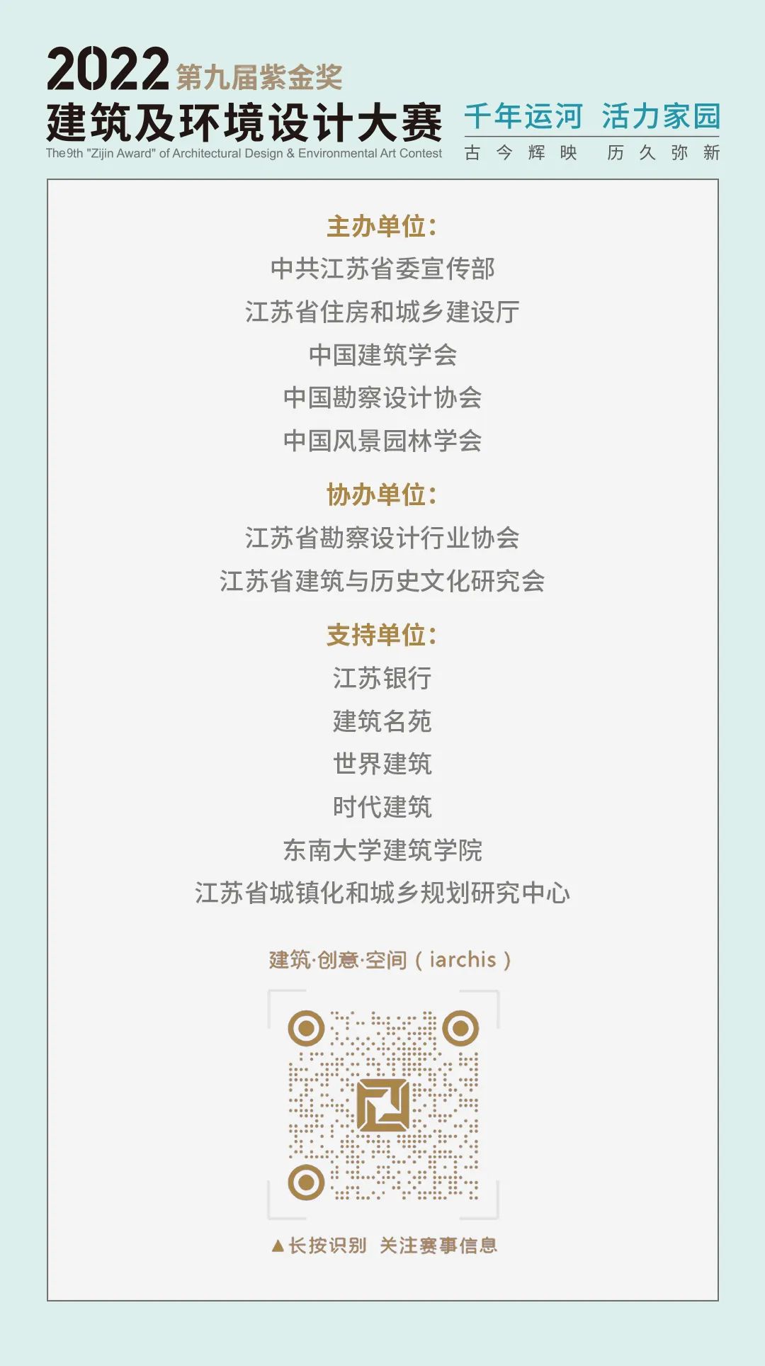 作为“紫金奖·文化创意设计大赛”的专项赛事之一,第九届“紫金奖·建筑及环境设计大赛”以“千年运河,活力家园”作为主题,共征集到1451项作品(学生组1038项、职业组413项),425家机构(院校)、6353人次参与赛事。大赛共产生紫金奖金奖4项、银奖6项、铜奖10名,优秀奖159项。
