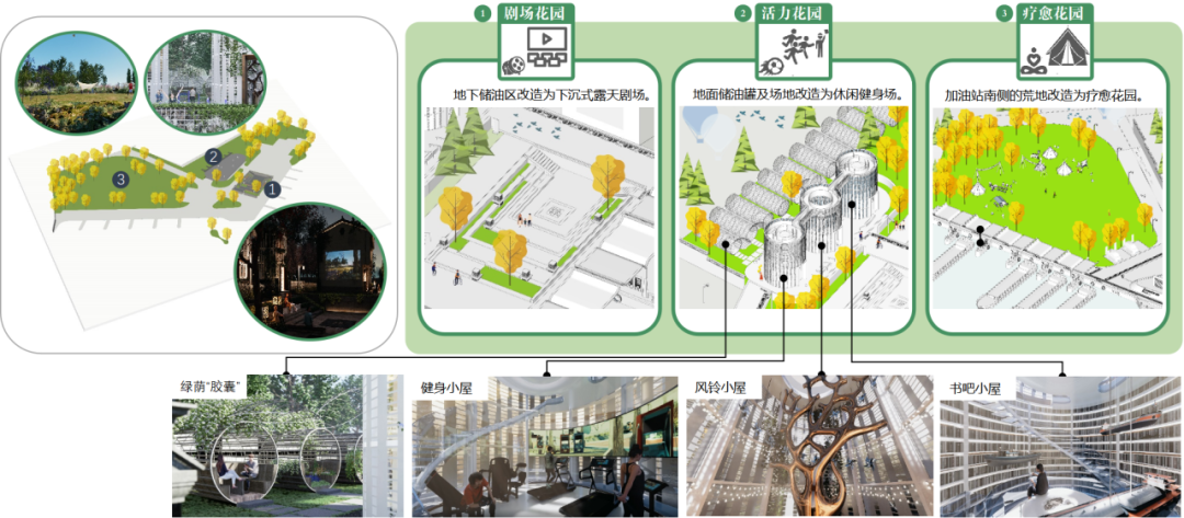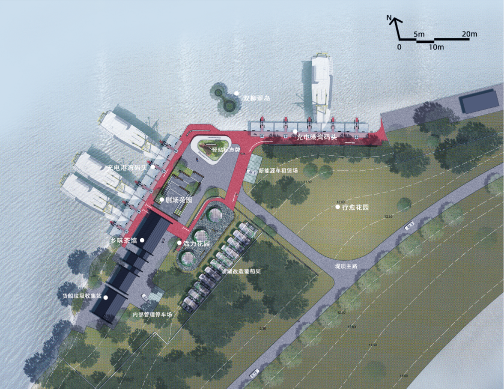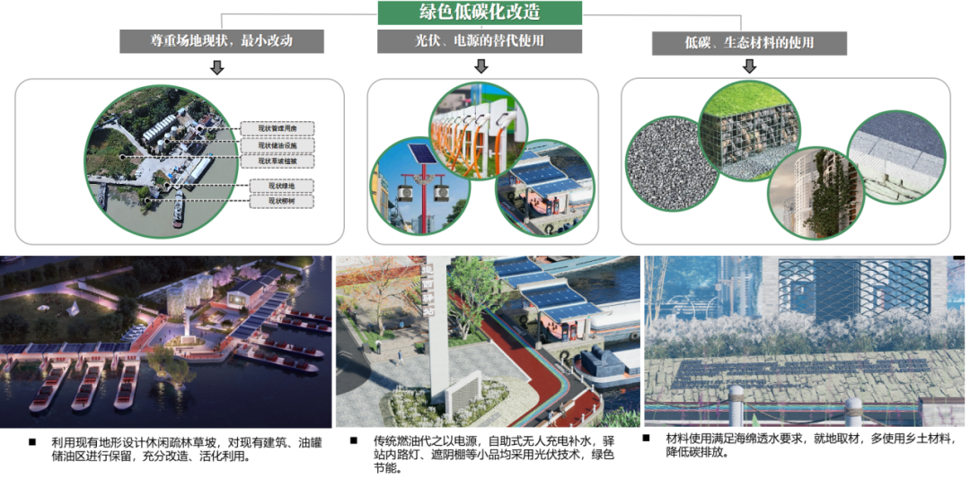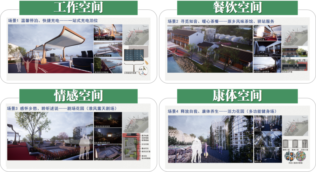 “佳游站”着重打造四个人性化场景:一是对现有停泊空间进行梳理,形成一站式自助充电的工作空间;二是改造既有建筑,打造为当地特色餐饮空间,给跑船人带来浓浓的乡情体验;三是结合下沉式场地,打造露天剧场花园,提供交流活动的公共空间;四是改造废弃的储油罐及设施,将其转变为花园式的休闲健身康体空间。