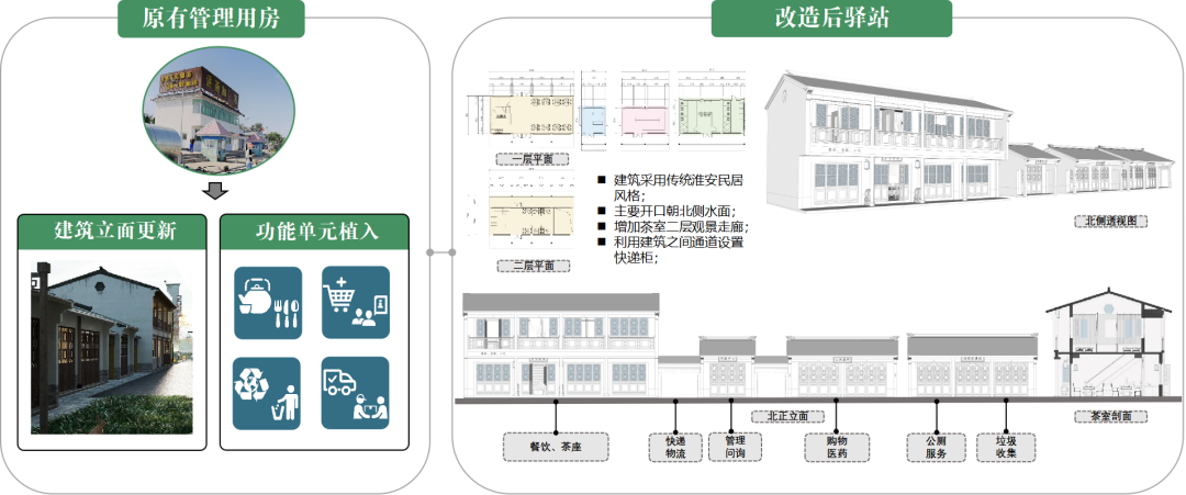 改造梳理原有的后勤管理用房,根据驿站分级配置特点,相应植入餐饮、茶座、购物、问询、快递投寄、垃圾收集等功能单元,将管理用房改造为彰显淮安传统建筑风貌的多功能复合驿站。