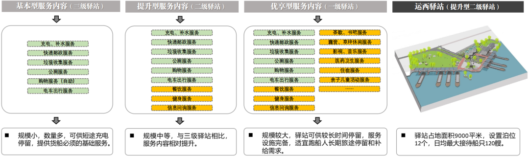 我们通过深入分析跑船人的真实需求,形成了有针对性的服务内容体系。按照不同的服务半径,提出分等级的驿站建设体系,对应差异化的服务内容和功能单元配置:三级驿站数量最多、建造规模小,以无人化的自助式服务为主,提供最基本的服务;一级、二级驿站客流较多,可根据实际情况增加相应服务内容。
