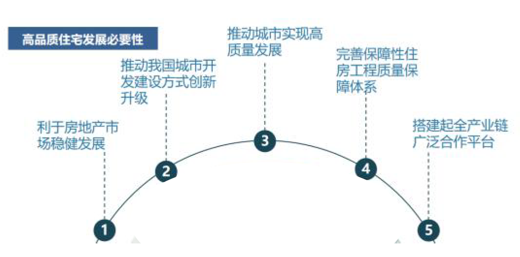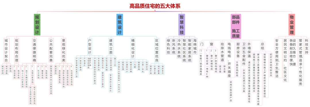 从第四代住宅产品的产生发展来看,随着经济水平的提高,社区发展进入成熟期,居民需求从刚性转变为改善性。这一时期,住宅综合水平提高成为主要趋势,住宅的“高品质”综合反映在规划设计、建筑设计、智慧科技、部品部件及施工质量、物业管理五大体系中。