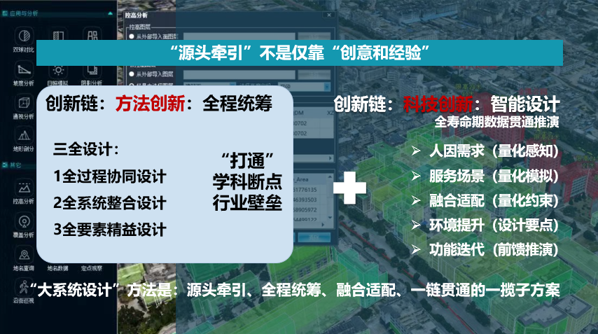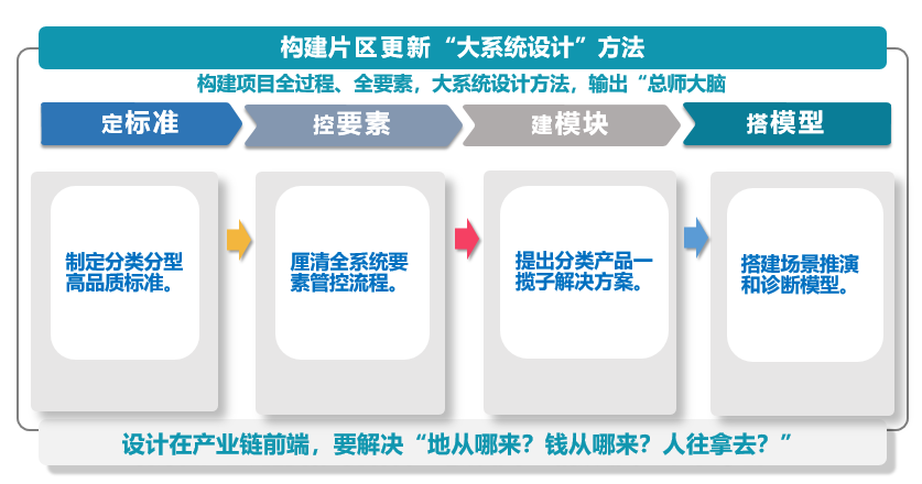 在多维更新时代,应构建 “大系统设计”的新方法,进行“人因、场景、环境”融合适配的设计,推广总体设计新思维。采用全程统筹的新模式,构建“需求提炼、场景推演、耦合适配、多维协同、分序评价”的大系统模型,进行产业协同、精工建造。建筑师们应输出“总师”大脑,以人的角度出发,创造人性化新生活场景。