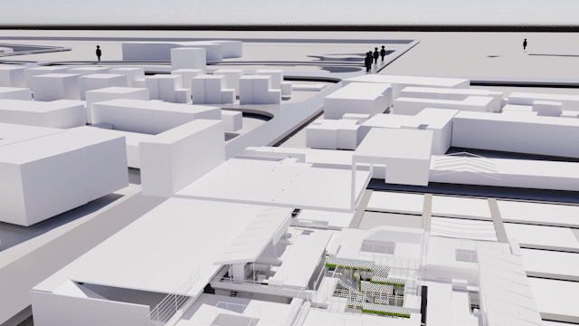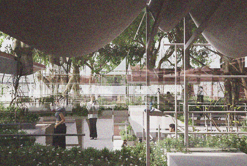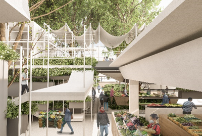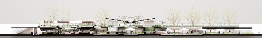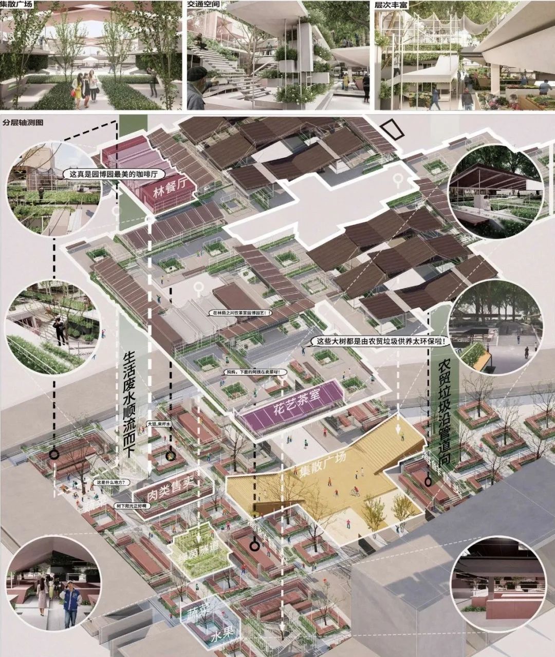 设计将农贸市场的生物废料利用到市场内园艺植物的绿色循环之中,以镇区的联动更新为导向,在保留市场烟火气的同时,改变传统农贸市场的布局模式,把菜市场打造成立体多层次、人人可参与的城市花境公园,让人们可以回归“林里”与“邻里”,营造更舒适更美好的场所氛围。