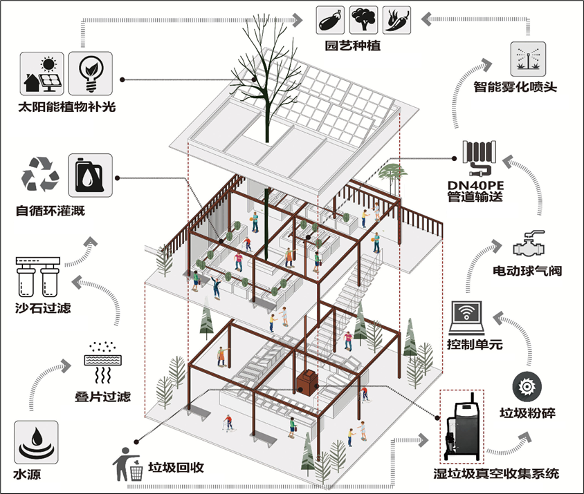 该系统包含垃圾回收端、垃圾处理端和浇灌施肥端,并配备了太阳能蓄电池供电系统等智能化的设计,尝试营造宜人、宜市、宜游的环境。