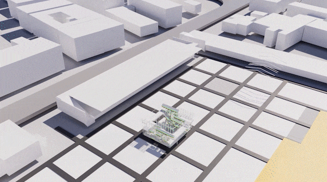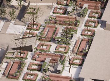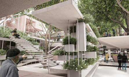 为3mx3m的四向售卖单元,绿树与顶部休憩平台联通,可供树下的人们嬉戏乘凉。