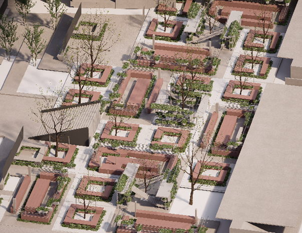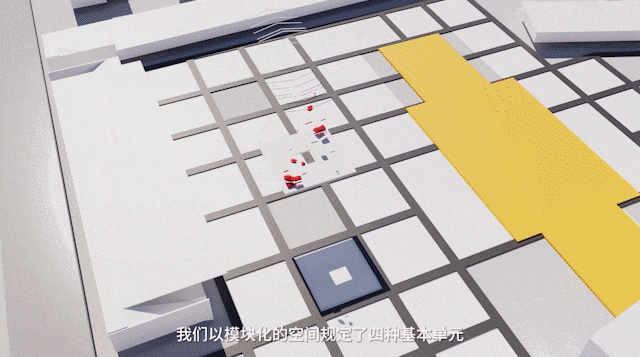运用模块化手法对传统菜场摊位进行优化设计,形成了四种基本空间单元:“绿茵隧道、果蔬售卖、生鲜熟食、林间餐厅”。以路为网、以树定位,四种单元空间均匀布置在场地之中,重组形成新的“集市+”功能空间。