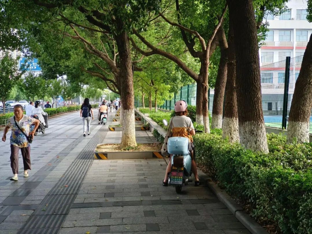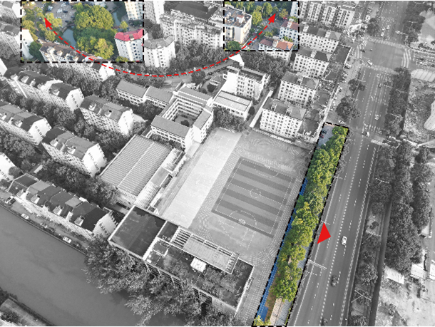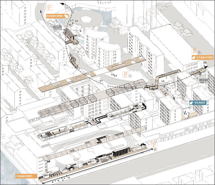 采用多出入口分流的接送方式。在校园南侧出入口增设连接校园、社区和沿街道路之间的架空廊道,引导学生至安全开阔场地,方便私家车和电动车接送;增设新的校园出入口,分流不同年级学生人群,利用新出入口周边较宽的人行道以及北侧地下非机动车库,提供电动车停放处;倡导周边商业中心地下停车场提供机动车错时共享车位。