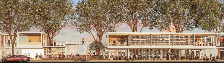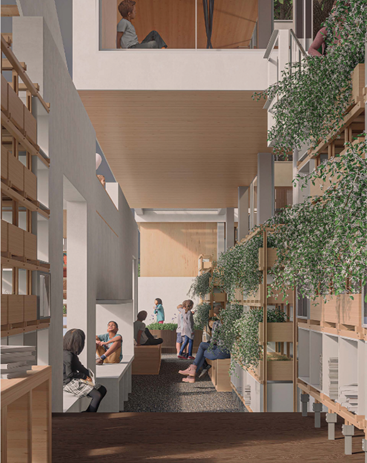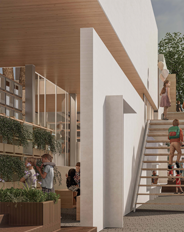 结合场地分时段的活动特点,以及不同群体、不同年龄段人群的活动需求,设计形成了以校园护学空间为核心的驿站设计策略:在校园西侧临街空间开辟新的出入口,沿线搭建功能灵活、布局集约的“树下”线型驿站;在校园南侧采用模数化预制构件,构建空中步道疏散体系,创造分时分区分层的多功能“护学空间”。