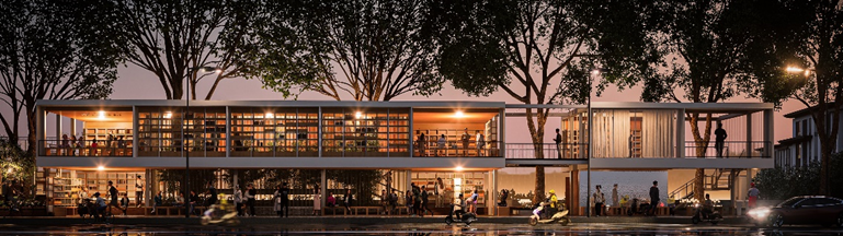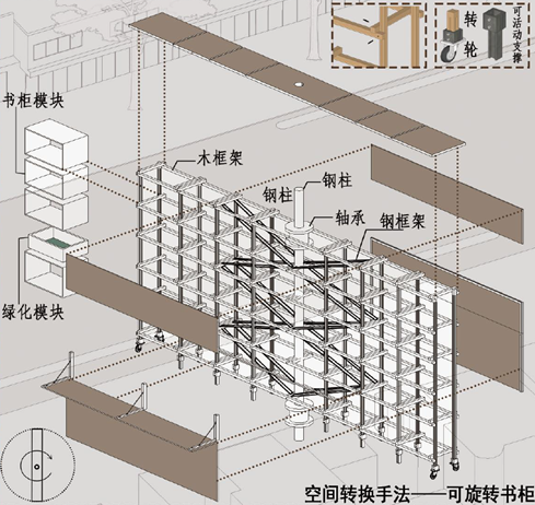 此外,驿站部分立面采用了可旋转的书柜模块设计,为人们提供阅读、交流和互动的共享空间。