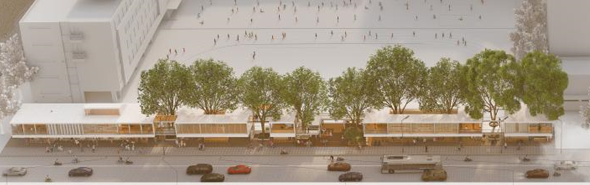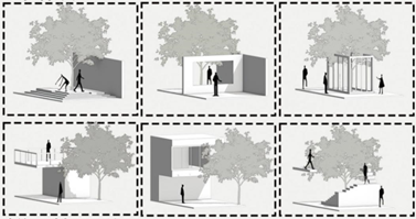 选取校园西侧交通便捷的临街界面,利用人行道一侧的闲置空间,新设一处校园出入口;利用场地内的“九棵行道树”为柱,见缝插针地在树冠与地面的间隙空间中,以装配式方式置入各种“功能盒子”,打造一处功能丰富,全龄段适宜的公共休憩驿站,让孩子可安全出行,让家长可休憩,让周边住区老人可活动,让外卖小哥能歇脚等。