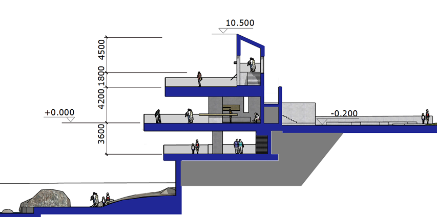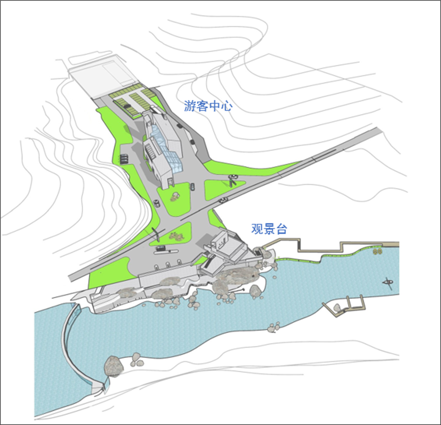 为保护原有生态环境并获得最佳观景效果,观景台临水而建,充分利用了坡地地形,避免了大面积开挖士方;观景台由2个承重柱和4个不同标高的平台构成,满足游客多视角、全方位的观景体验。