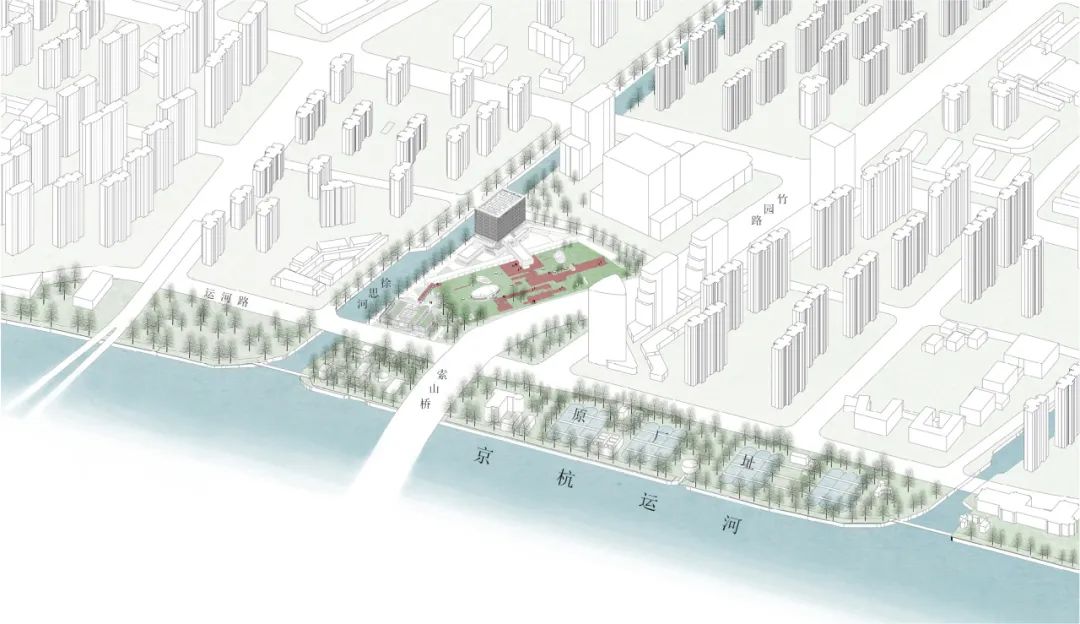 同时,结合相关上位规划提出的该地段“打造宜居乐活文化的山水游廊”的功能定位,我们希望通过这一项目能够作为修复地区景观生态网络的先导与示范。秉持灰色与绿色基础设施的立体叠合的设计理念,促成生态景观资源向高密度城区的渗透与延展,并联动滨河生态修复,最终融入到京杭运河景观生态廊道体系,形成生态景观和游憩功能相结合的开放性绿色空间。