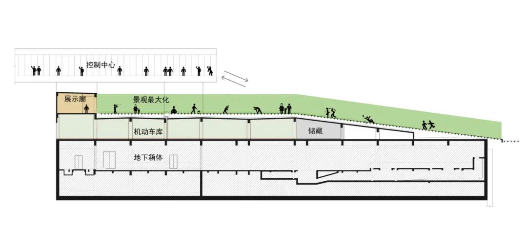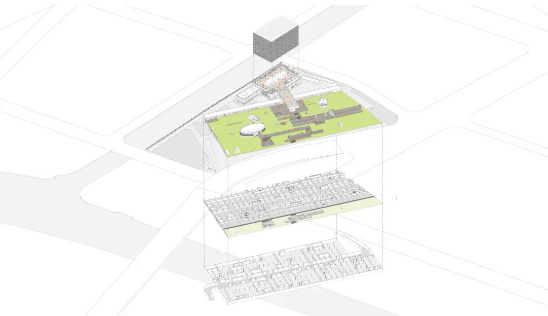 同时,项目积极促进水厂与附近社区在空间与功能上的联系。一方面在地下设备车间与地上斜坡公园之间设置社会停车场,为附近的居民与外来访客提供停车服务;另一方面,在停车场上部设置对公众开放的公园绿地,为高密度城市提供绿色开放空间。