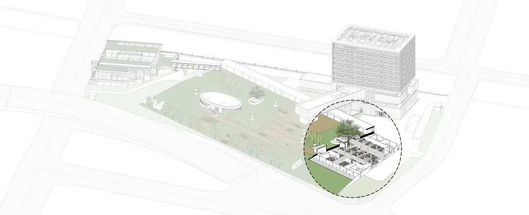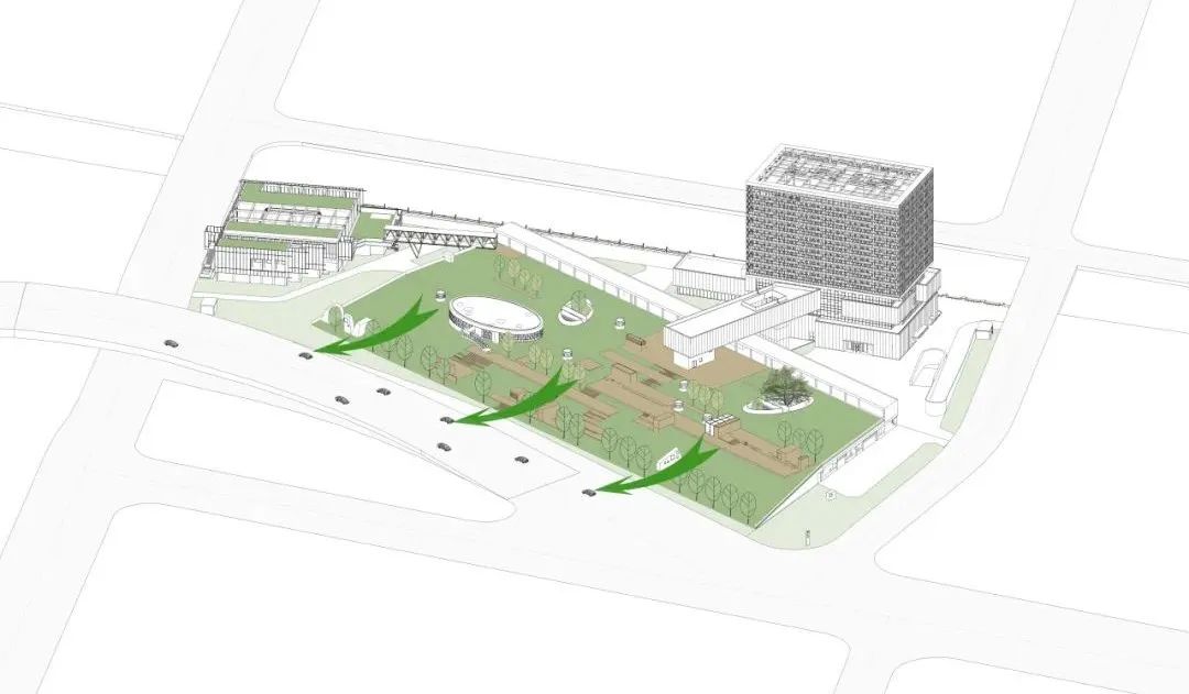 此外,项目还将被动式采光、通风、遮阳等绿色需求与建筑空间进行系统的整合设计。如结合疏散梯、排风井设计在停车场设置采光天井,预留结构荷载增加树穴,形成立体的绿化空间,让停车人员有更好的空间体验;在公园楼面增设圆形采光井,增加车库采光与通风,减少日间灯光的使用;