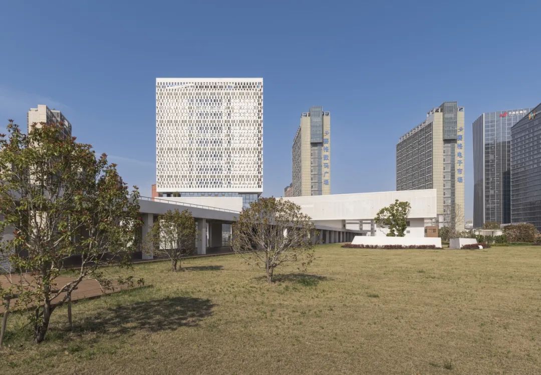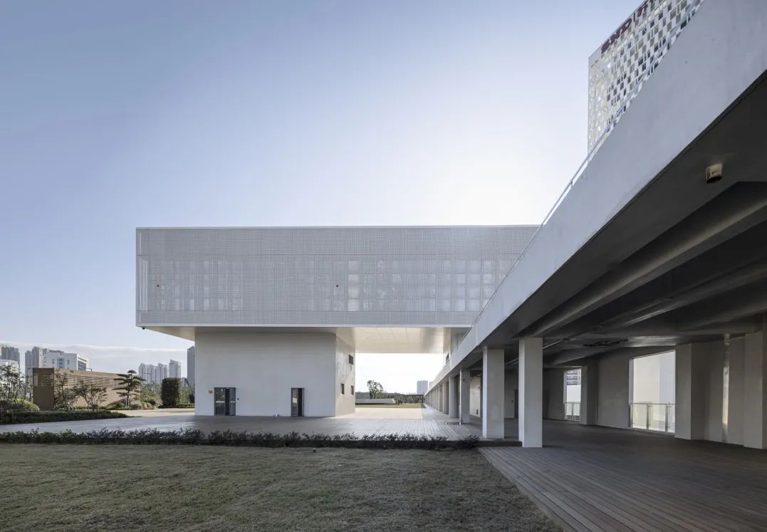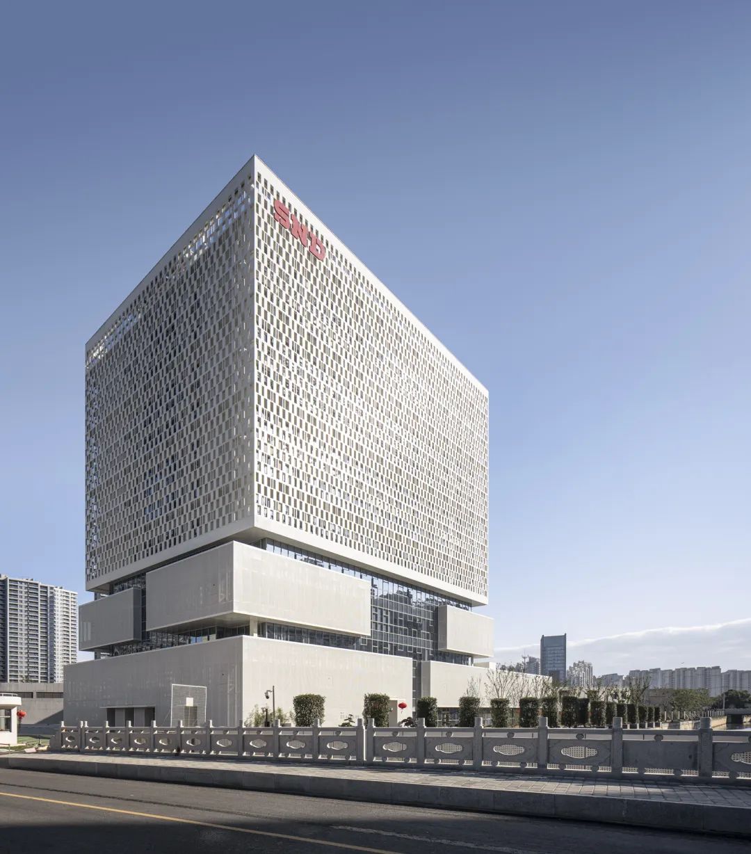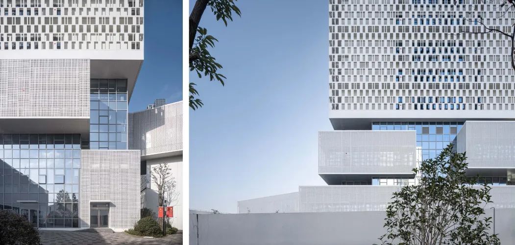 主体办公建筑以方正端庄的白色矩形体块的建筑形态来呈现。在立面细节上,办公建筑采用白色窗花纹镂空铝板包裹,形成精美而细腻的遮阳表皮。其中,白色是苏州民居的基本色调,窗花纹图案则可视为苏州园林木格栅窗的转译。