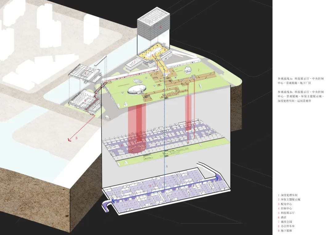 在公园绿地的环保主题长廊中策划展示污水净化技术与环保理念的系列科普教育空间,为当地居民或外来访客提供水循环文化的沉浸体验。通过环保主题长廊的引导,向东穿越深度处理车间,可直抵运河滨水景观带,促成了办公综合楼、绿坡公园、地下水厂及运河滨水景观带之间的活动链接,促成一系列丰富多彩的“事件”在空间中上演,绿色环保的理念也在城市日常生活中自然而然地渗透。