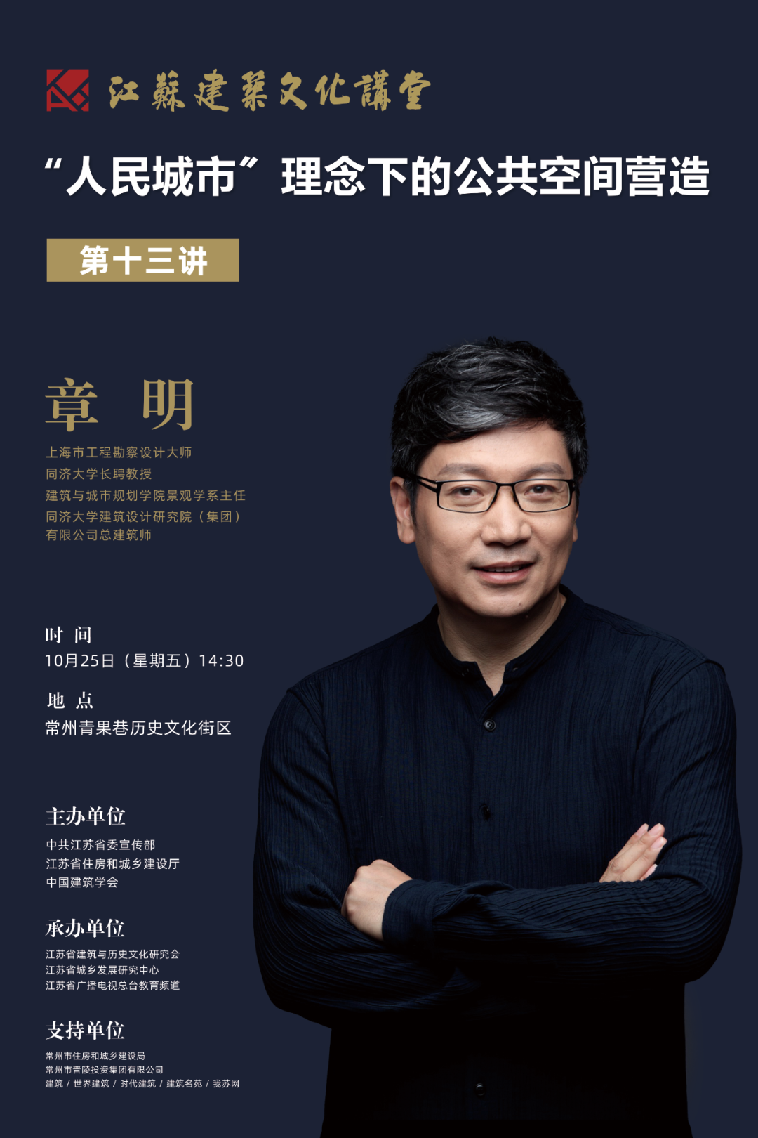 由中共江苏省委宣传部、江苏省住房和城乡建设厅、中国建筑学会联合主办的“江苏·建筑文化讲堂”第十三讲将于10月25日在常州青果巷举办。本次讲堂由上海市工程勘察设计大师章明担任主讲嘉宾,作题为《“人民城市”理念下的公共空间营造》的演讲。