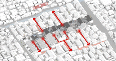 我们以三个方面的“强化”来应对上述问题。一是强化步行空间的引导衔接。在社区核心街巷志恒里南北设置主题广场,主动对接平江路与观前街之间的肖家巷、钮家巷,提升对东西向穿行人流的引导作用。二是强化界面空间的渗透性。在邻接平江路的巷道与滨水空间,设置多个开放性的共享微园节点,来提升视觉吸引力。三是街巷以年轻态主题为主,是对街区功能的补充和完善。