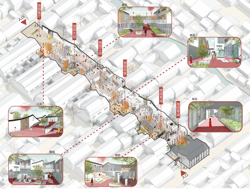 设计在街巷内打造了多个主题中心微园,并植入多元功能,塑造了有活力的园林式院落空间环境。