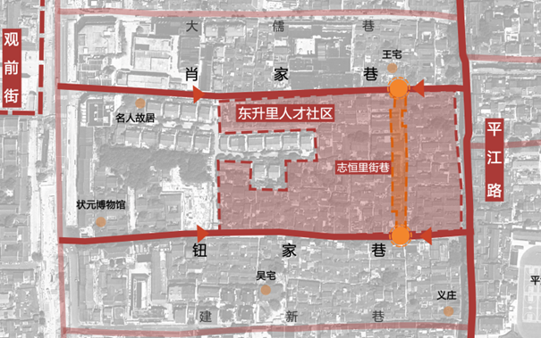 我们选择的设计单元位于苏州平江九巷中南部的东升里人才社区的志恒里街巷。该单元也是大赛“平江九巷”专项合作赛道的设计基地,该基地设计任务是要围绕高层次人才社区的发展目标,鼓励对街巷空间品质的优化提升,提高传统民居的宜居性。